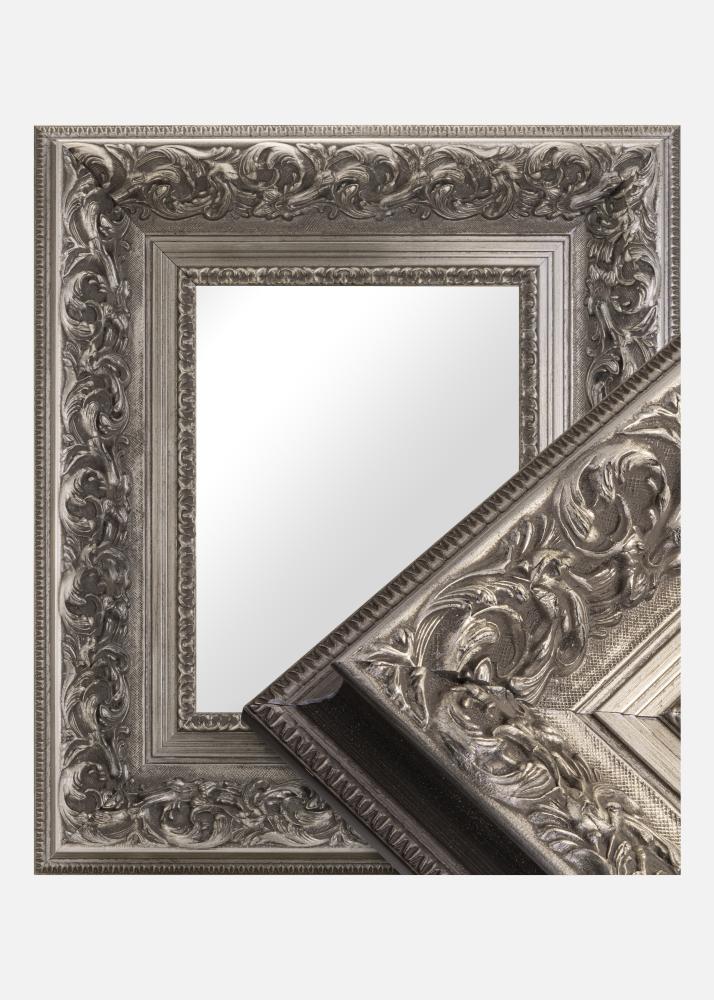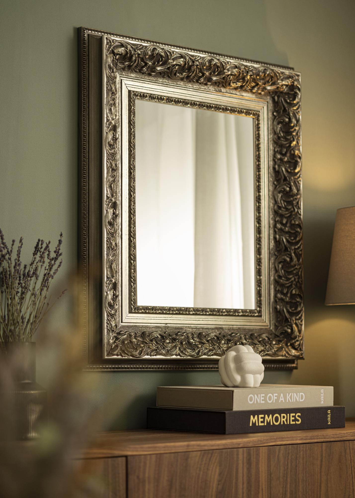 La richesse des détails complexes dans le cadre du miroir est mise en valeur par le relief profond, où des motifs de feuilles sculptées créent une impression d'élégance et de style. La finition du cadre combine des tons argentés clairs et foncés, ce qui donne au miroir une belle patine et une esthétique intemporelle. Cette combinaison de couleurs et de motifs fait de ce miroir un choix parfait pour des thèmes classiques et des encadrements nécessitant un petit plus.
