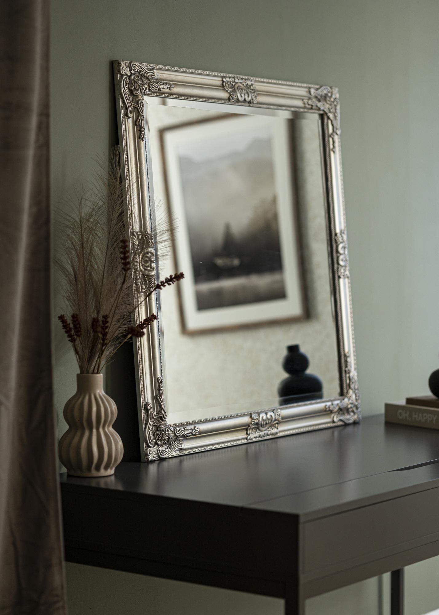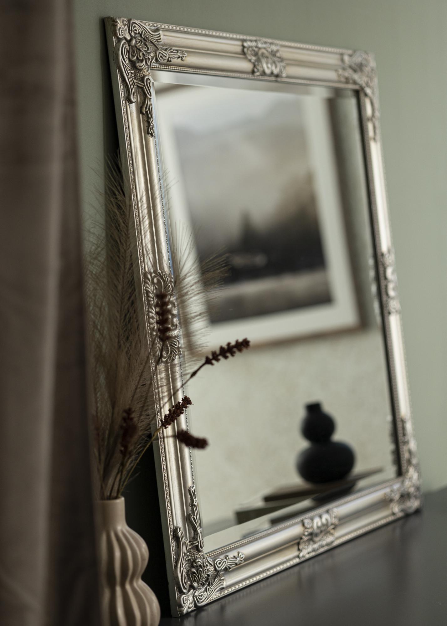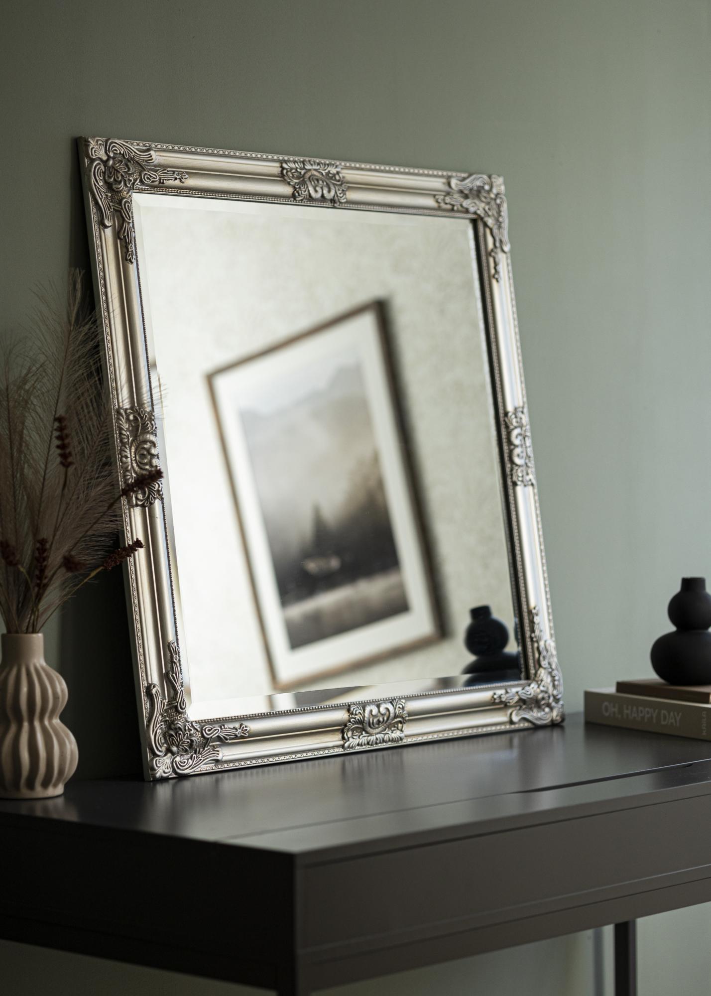 Le cadre de ce miroir est un véritable élément attrayant, riche en ornements élaborés de style baroque qui ajoutent une touche de luxe et d'histoire à la pièce. La forme carrée crée une esthétique symétrique et équilibrée qui complète la plupart des styles de décoration intérieure. Le cadre couleur argent du miroir renforce son expression élégante et en fait un élément polyvalent dans la maison.