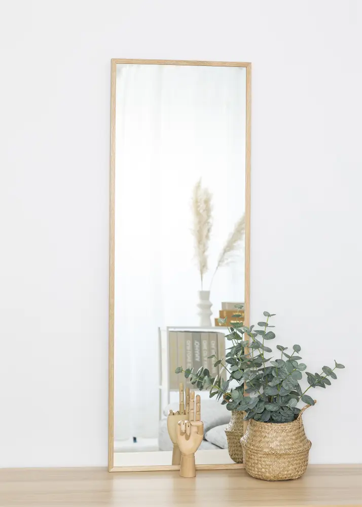 Voici un miroir mural doté d'un fin encadrement en bois qui conviendra aussi bien dans les intérieurs modernes que les intérieurs bohèmes. Le miroir est un exemple de design scandinave sous son meilleur jour, avec un verre miroir incolore et un cadre en bois clair avec un profil droit, le tout apporte une impression fraîche et lumineuse.