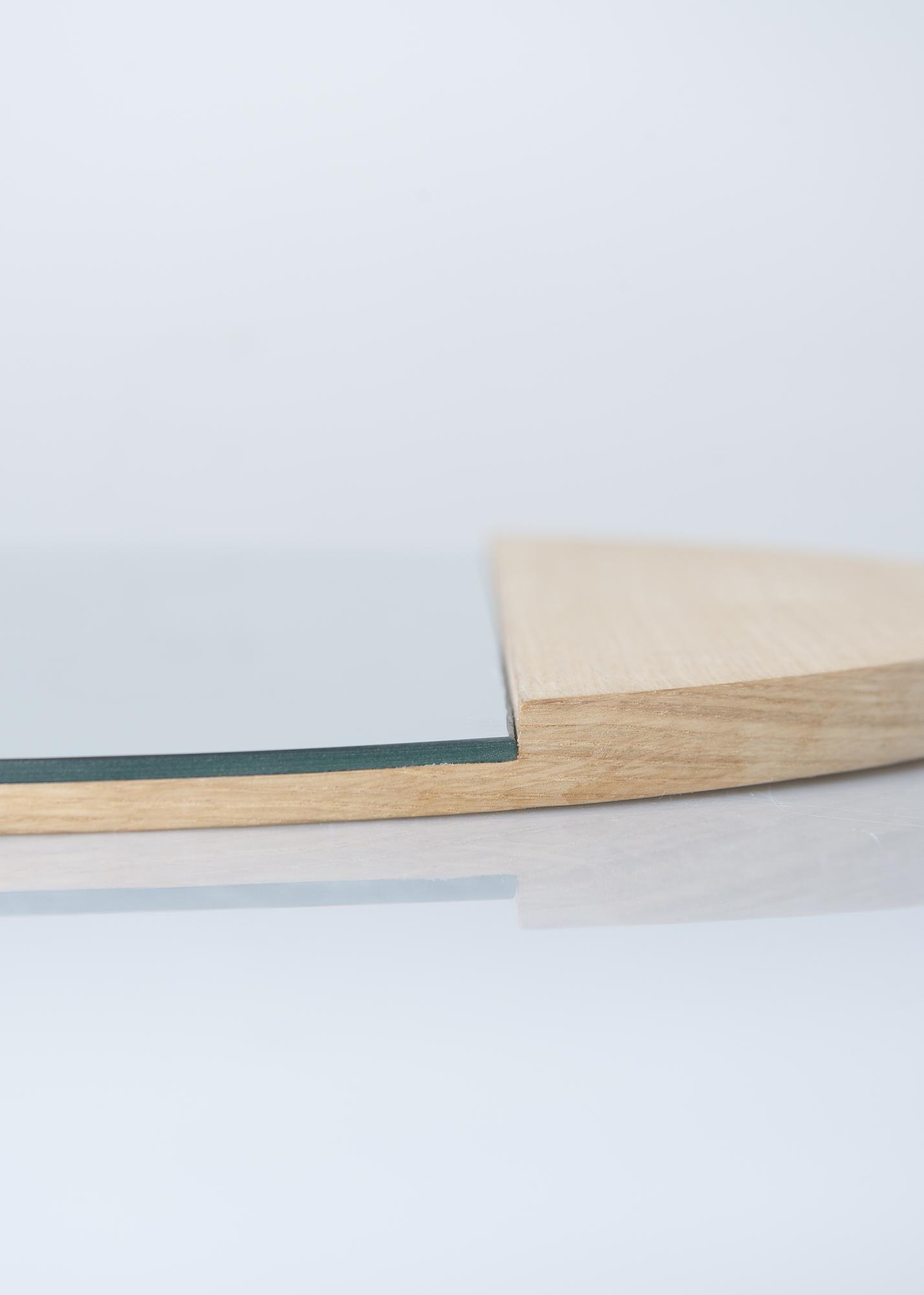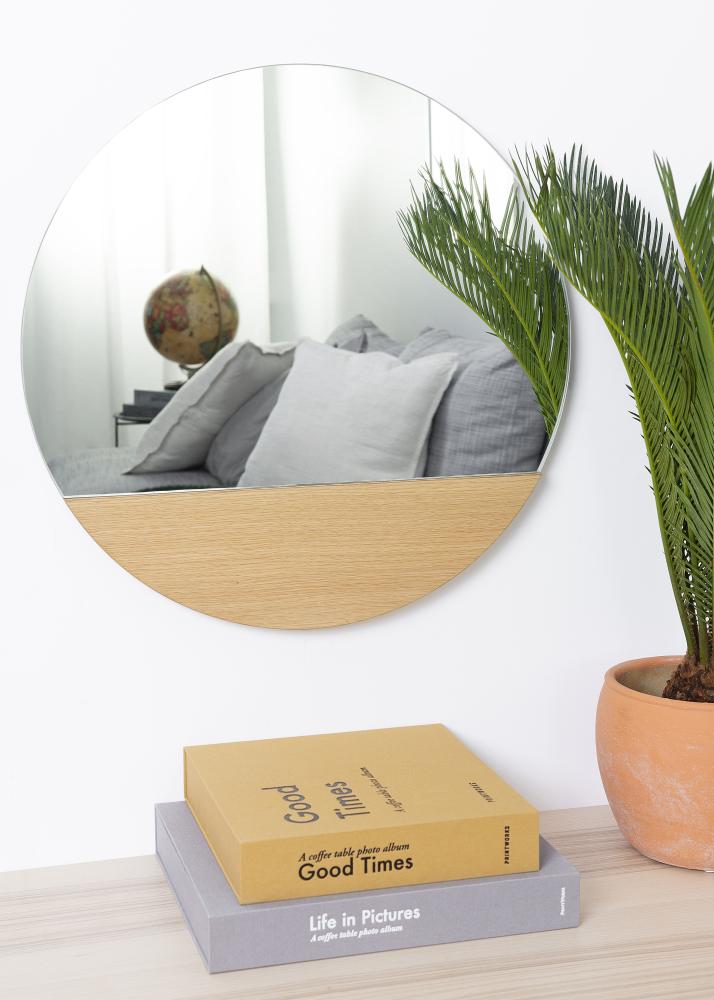 Ce miroir mural rond a un détail simple, mais très décoratif, le miroir est pourvu de chêne sur sa partie inférieure. Un détail simple qui rend l'ensemble du miroir plus intéressant !