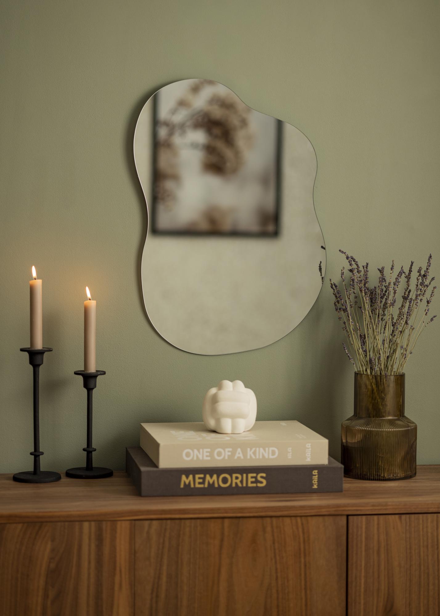 Curvy Cloud est un miroir mural élégant dans un design unique avec sa forme asymétrique. Les bords créent un motif ondulé très doux qui, associé à l'absence de cadre de miroir, apportent une impression minimaliste. Le verre réfléchissant mince de 4 mm contribue également à cette sensation. Le miroir peut être fixé au mur à l'aide des supports à l'arrière.
