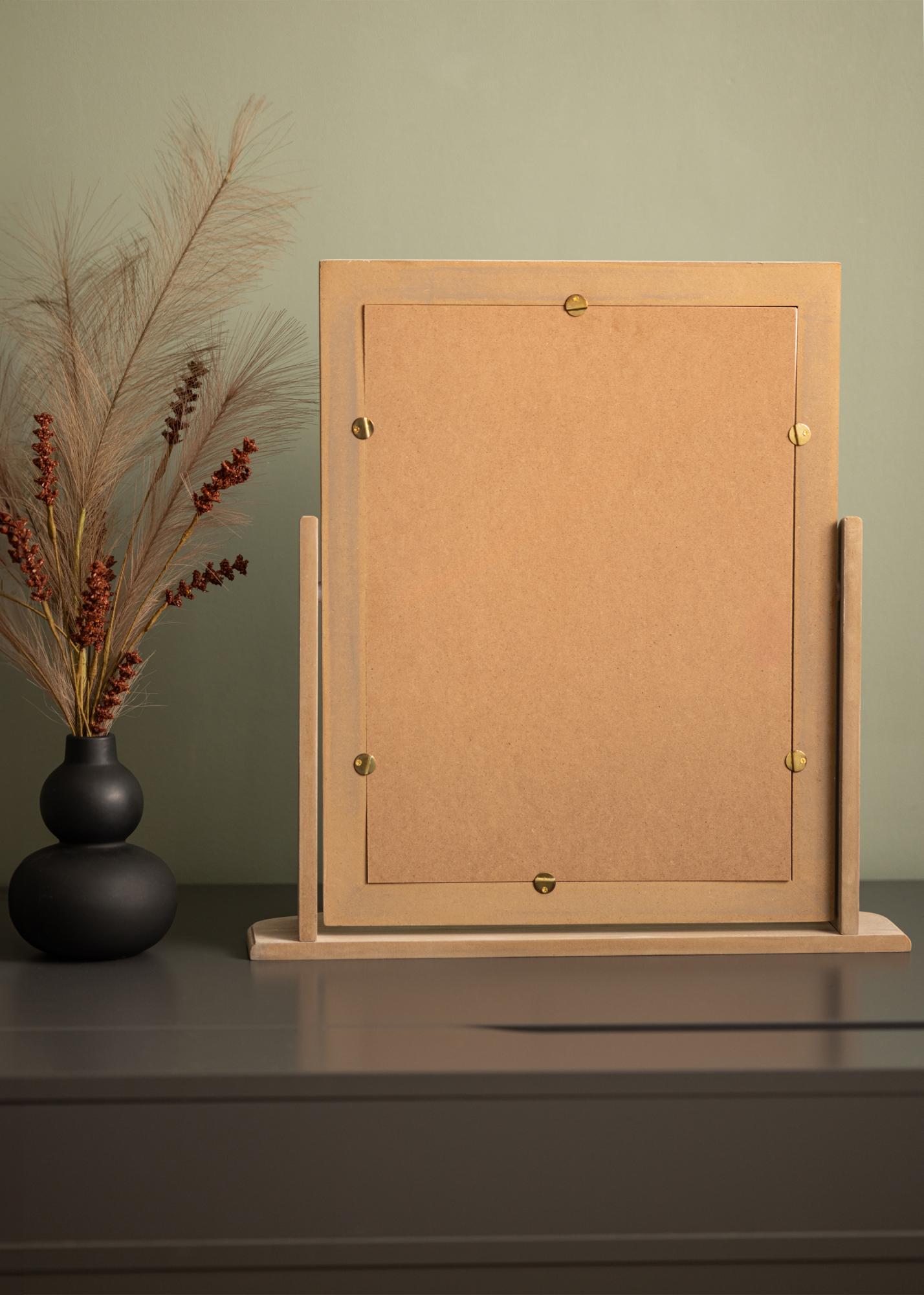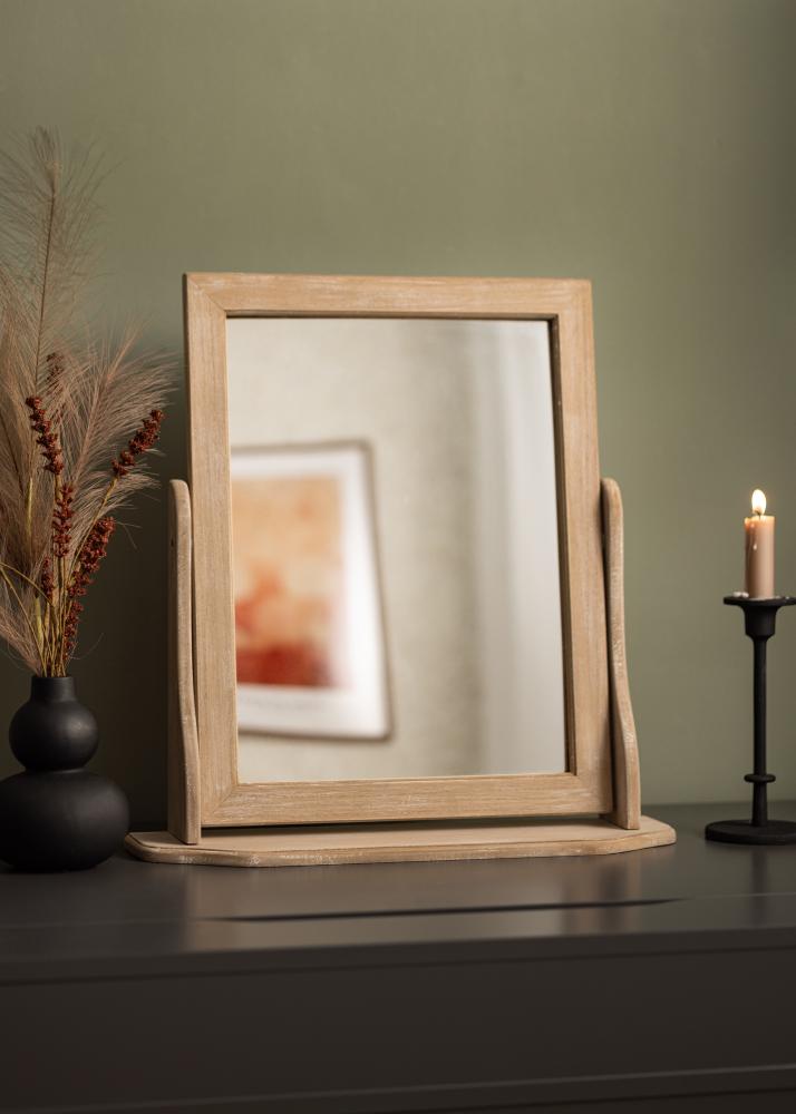 Le miroir est solidement posé sur un pied robuste, conçu pour être placé sur une coiffeuse ou une commode. Sa forme rectangulaire est classique et apporte une touche douce à la pièce, tandis que sa réflexion claire assure que vous vous voyez sous votre meilleur jour.