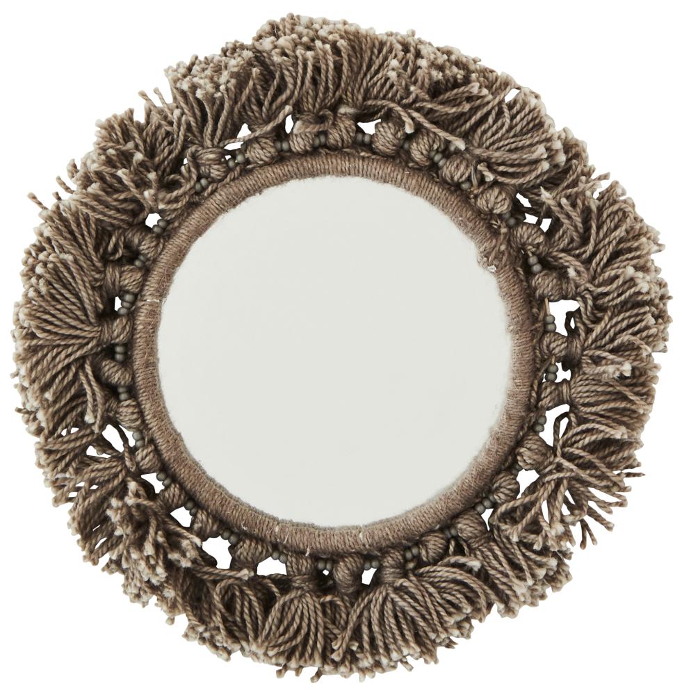 Ce miroir de poche de Madam Stoltz est à la fois pratique et plein de caractère. Grâce à sa taille compacte, avec un diamètre de seulement 11 cm, il est très facile à transporter dans votre sac ou la poche de votre veste. Le miroir est fait de verre et de coton, avec des glands décoratifs qui ornent les bords. Il est disponible en différentes couleurs, dont la couleur grise naturelle de celui-ci.