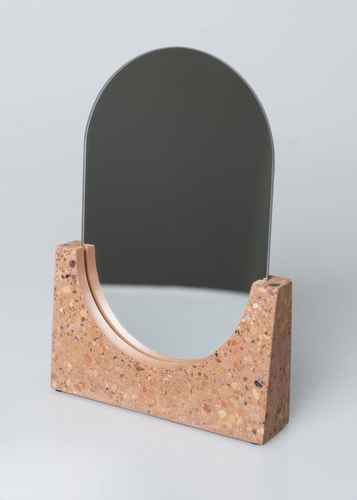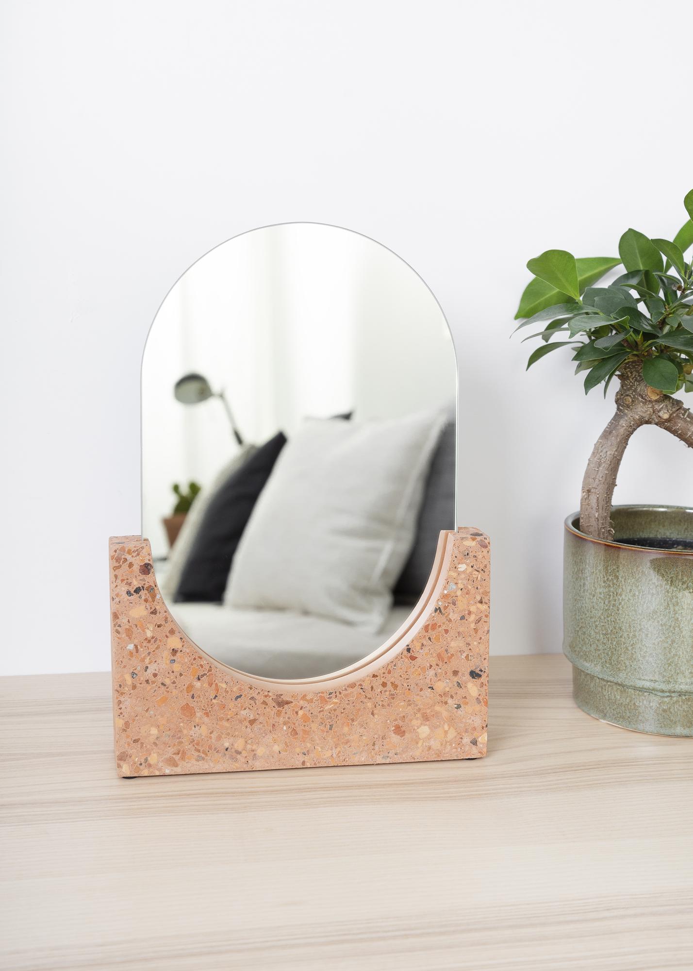 Ce miroir de table du danois Hübsch est vraiment quelque chose qui sort de l'ordinaire. La forme ovale douce en combinaison avec le ravissant support en terrazzo (pierre artificielle) rouge rend le miroir de table très saisissant et invitant.