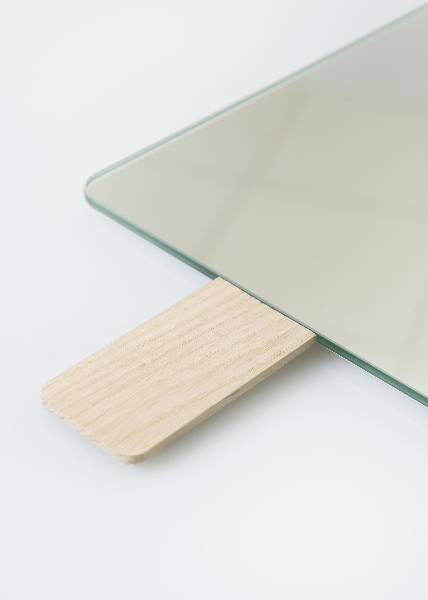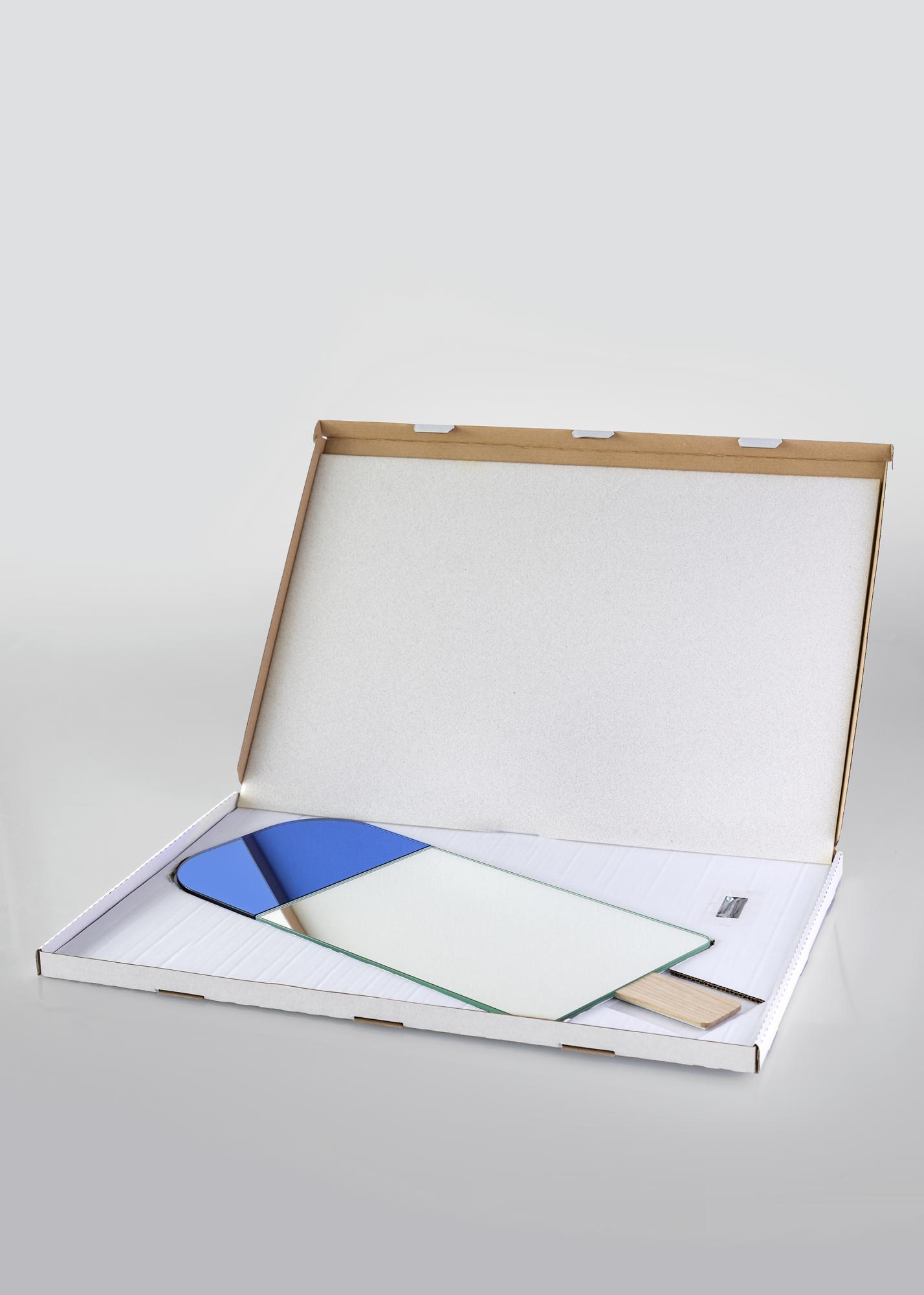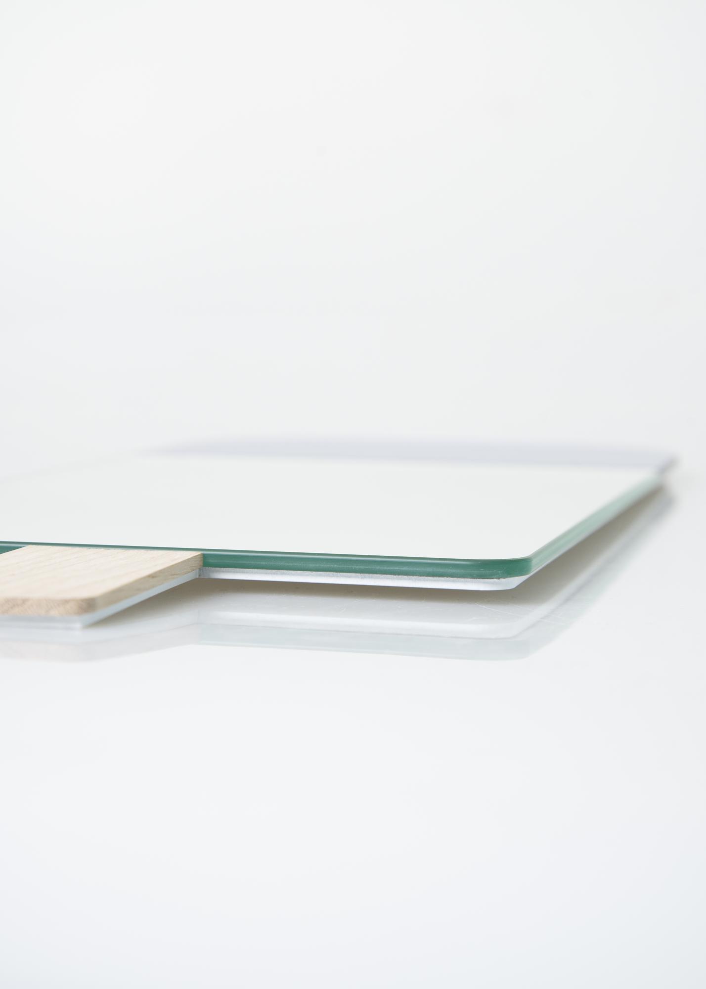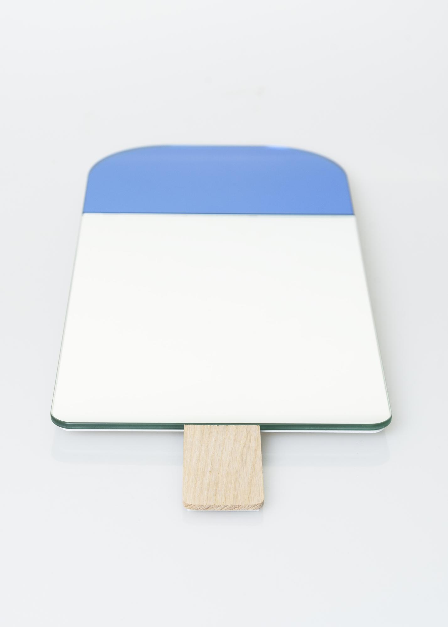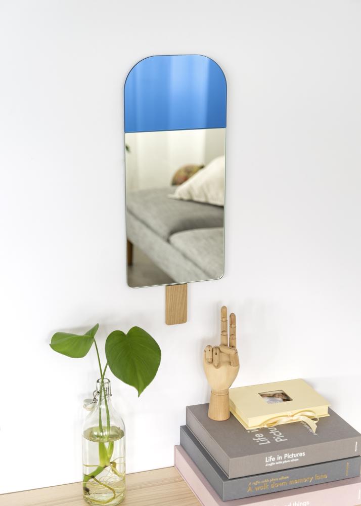 Le miroir en forme de glace est conçu par Tor et Nicole Blancner Servé pour Danish Elements Optimal (EO). La partie supérieure colorée est disponible en plusieurs couleurs, dont cette variante présentée dans la couleur Ocean Blue.