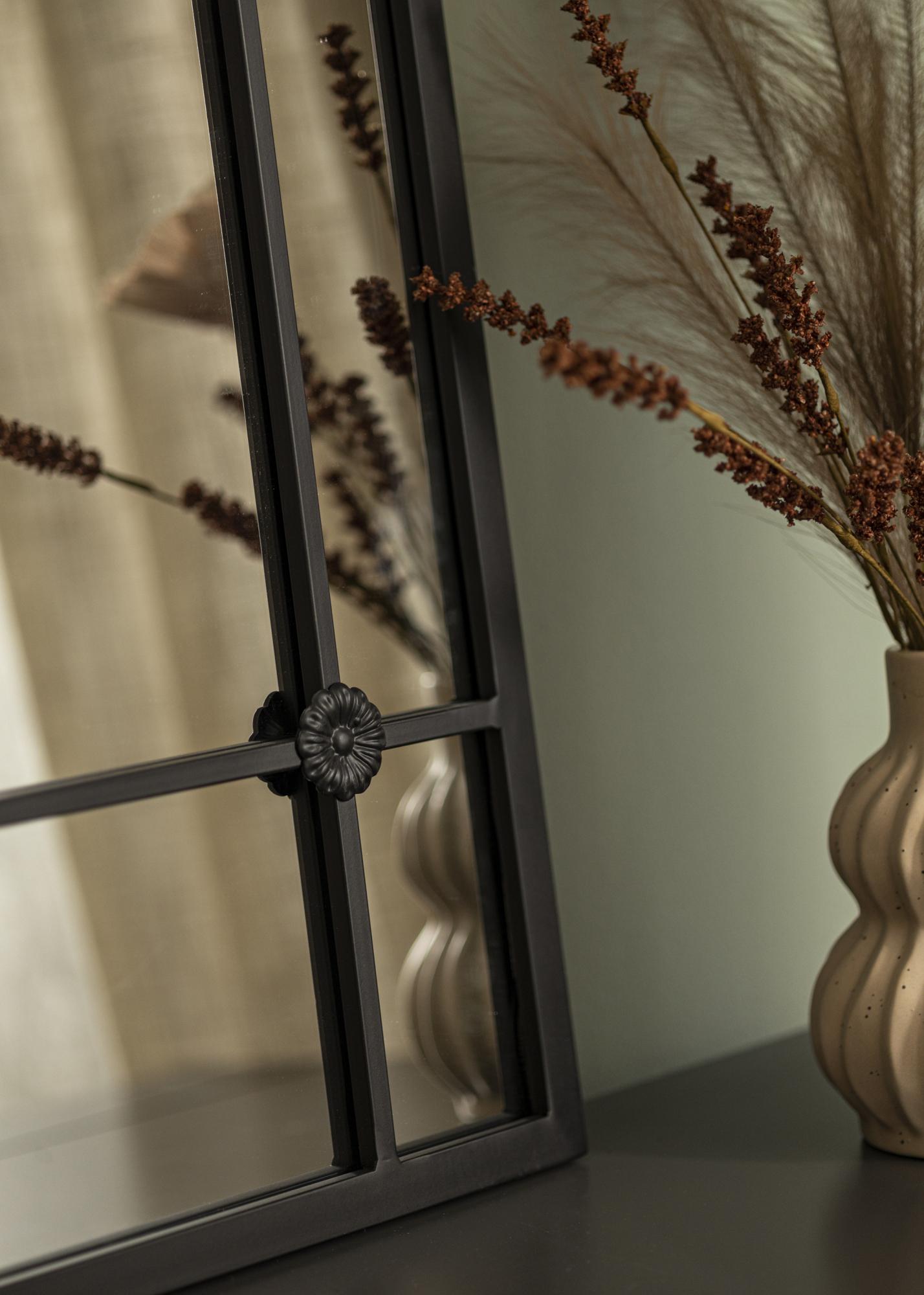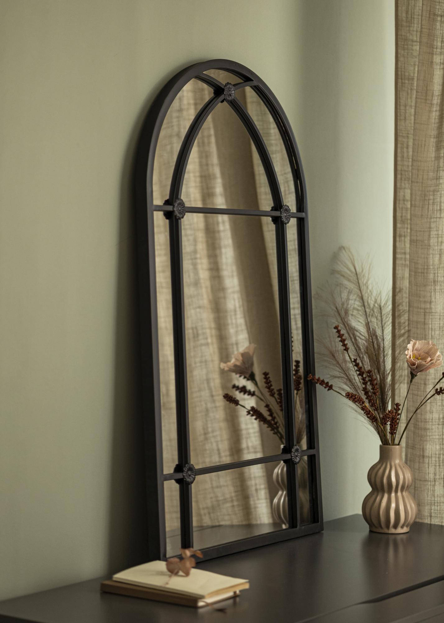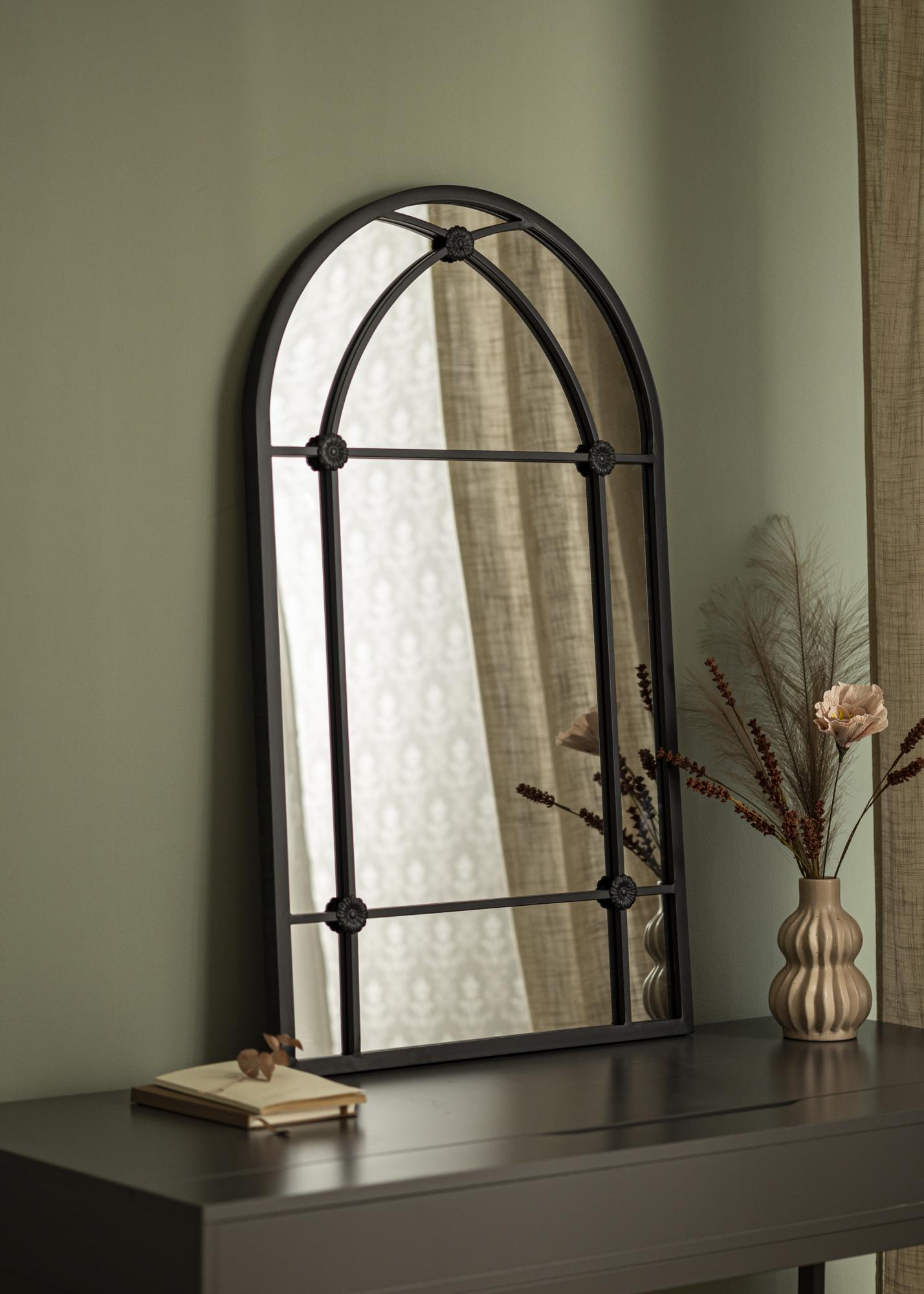 Avec sa silhouette arquée et sa ferronnerie détaillée, le miroir rappelle les fenêtres classiques qui apportent une sensation de profondeur et d'espace dans la pièce. Ce n'est pas seulement un objet pratique pour un usage quotidien, mais aussi un détail décoratif artistique qui attire le regard et contribue à l'atmosphère de la pièce.