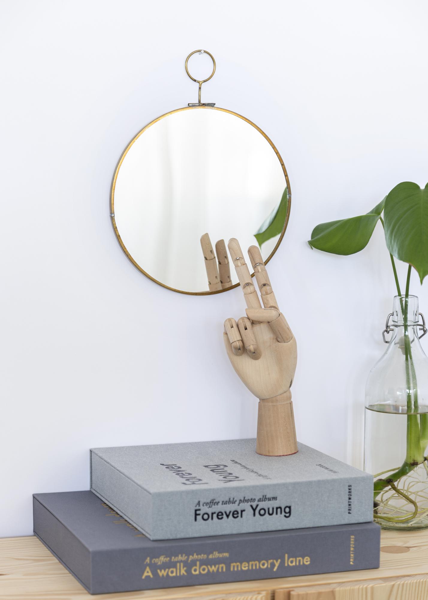 Ce miroir rond a un design épuré et très fonctionnel. Autour du miroir court un bord fin et coloré en laiton élégant. Le dessus du miroir est pourvu d'un petit cercle, de plus d'être un détail décoratif il permet également une suspension simple et pratique.
