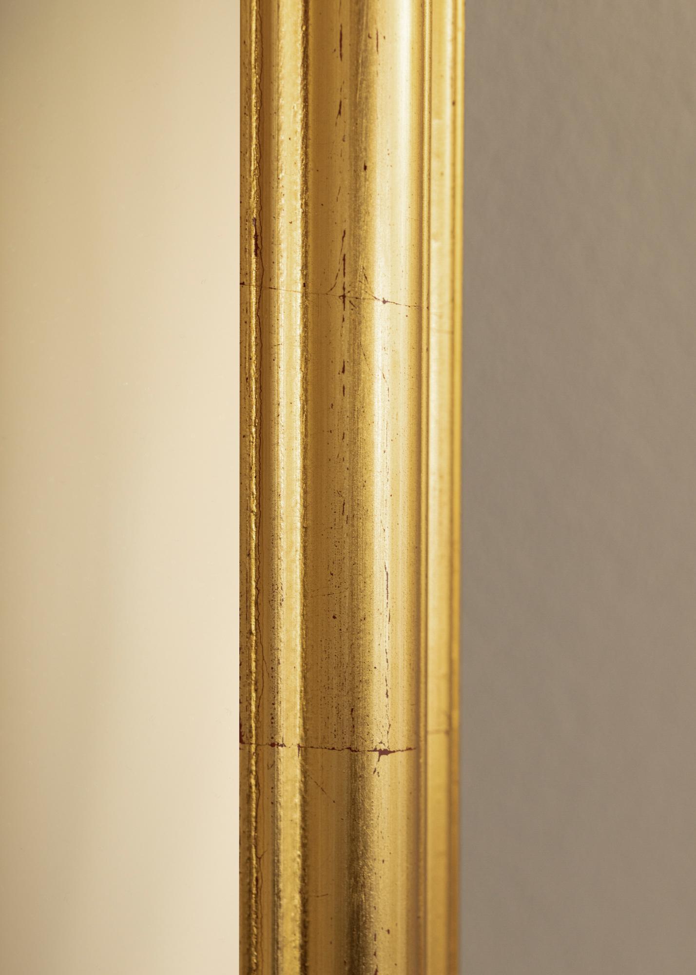 Le cadre est fabriqué en bois d'ayous et possède un profil légèrement incurvé qui contribue à l'apparence sophistiquée du miroir. La surface est patinée de manière antique avec des craquelures subtiles et de petites touches sombres, donnant au miroir une sensation vintage authentique. La finition dorée crée une ambiance chaleureuse et classique, parfaite pour apporter à votre maison une touche d'élégance intemporelle.