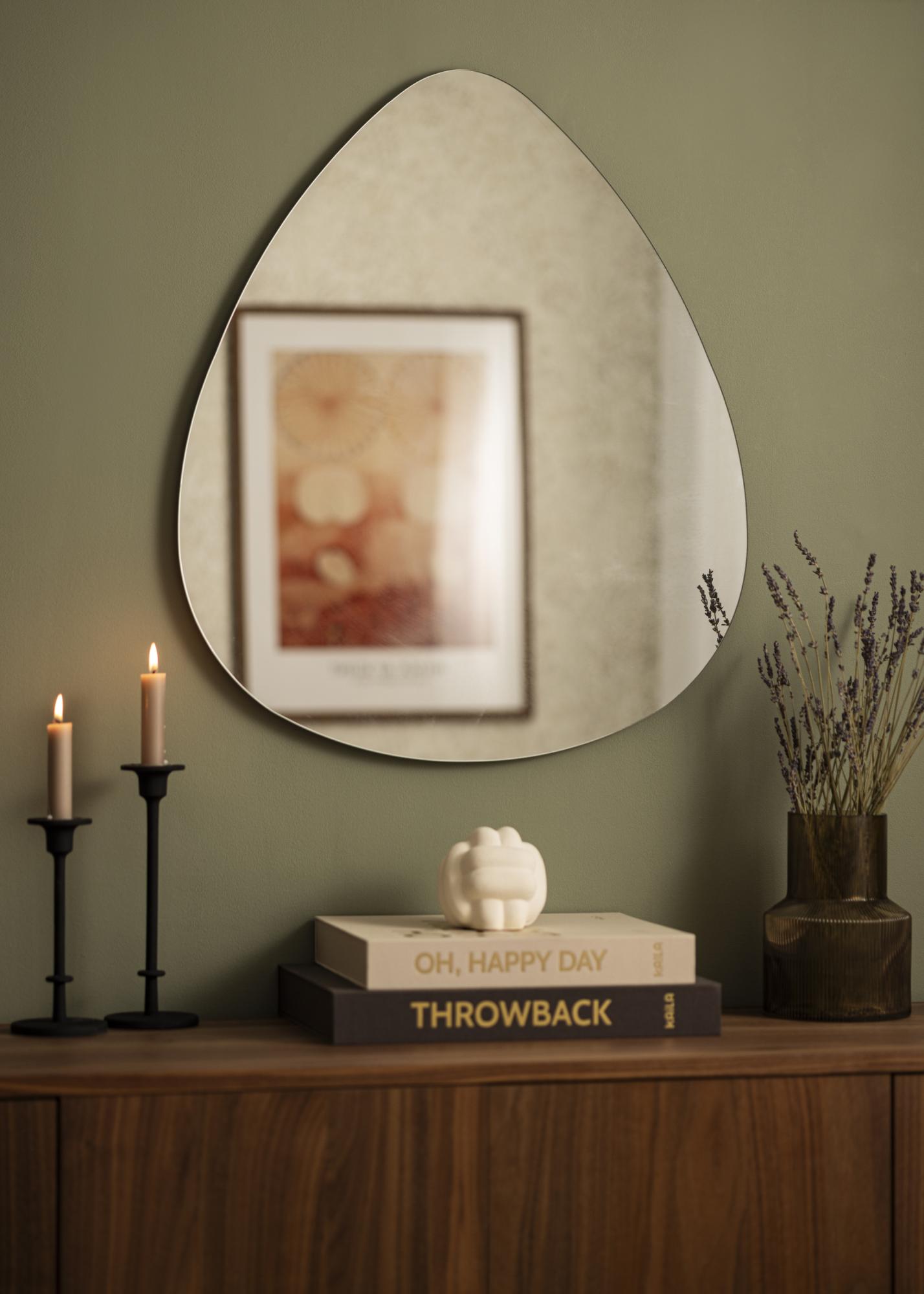 Le design du miroir est à la fois moderne et intemporel, avec une large partie supérieure légèrement effilée et arrondie qui crée une silhouette distincte en forme de goutte. Cette forme apporte douceur et une touche organique à la pièce, ce qui fait que le miroir s'adapte à une variété de styles de décoration.
