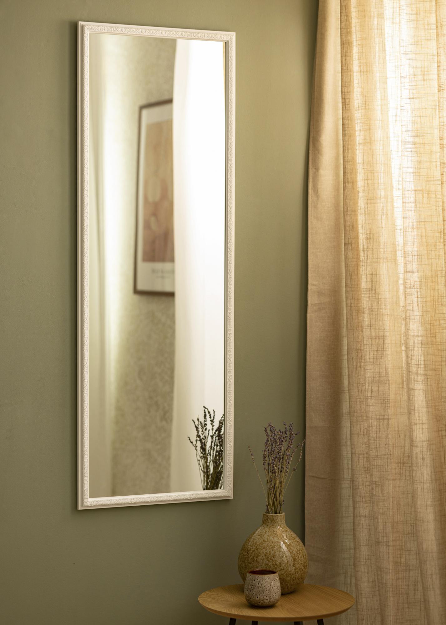 Ce miroir mural est un détail d'intérieur élégant qui reflète magnifiquement la lumière des diverses sources lumineuses de la pièce où il est placé. La baguette de cadre blanche donne une impression lumineuse et fraîche, se mariant parfaitement avec le joli profil décoré de beaux motifs .