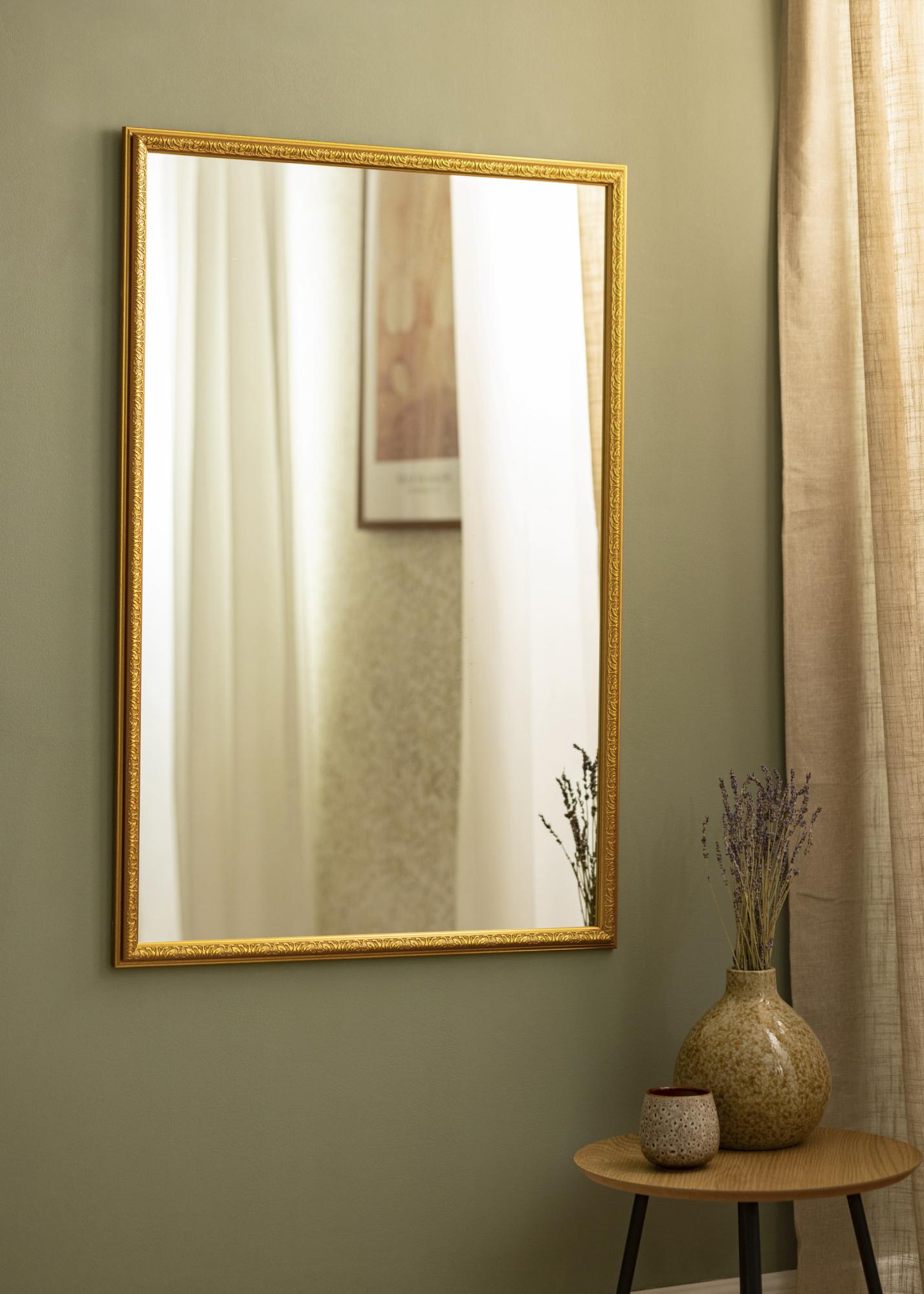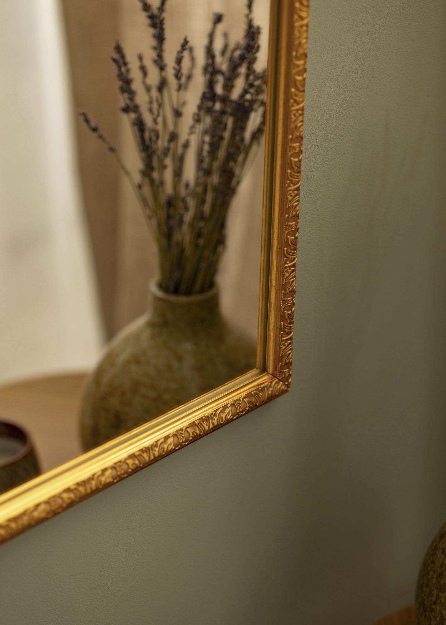 Si vous êtes à la recherche d'un miroir doré luxueux, vous pouvez arrêter de chercher maintenant. Nostalgia Guld est un miroir mural avec un cadre de 2,8 cm de largeur ayant un profil élégant et un beau motif décoratif. Le verre du miroir reflétera la lumière dans votre pièce, tout en faisant du miroir un détail stylé sur votre mur. Un dispositif de suspension est disponible à l'arrière pour une accroche plus facile.