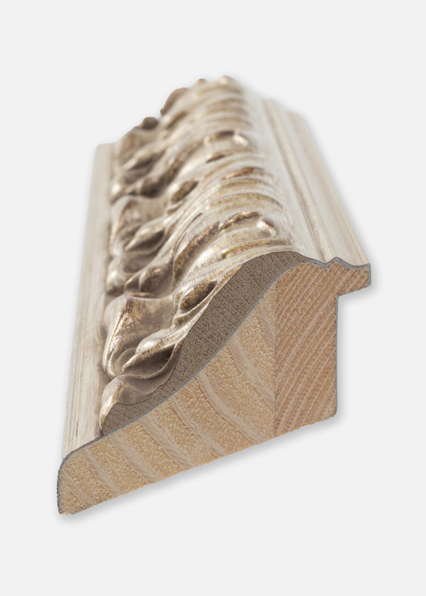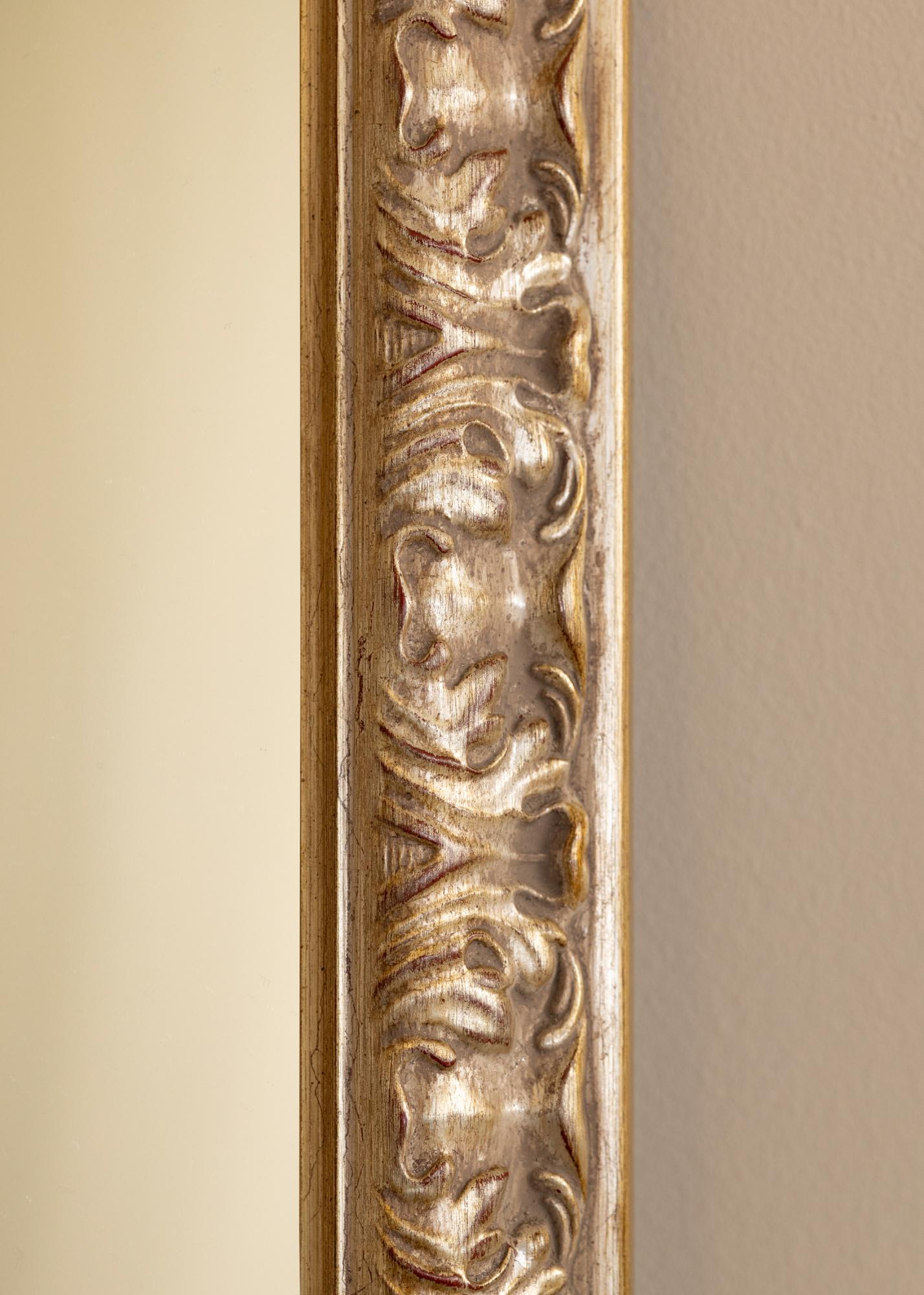 Le cadre est fabriqué en pin avec une finition argent antique avec des détails dorés subtils et des touches de rouge. Cette combinaison de couleurs crée un beau contraste et donne au miroir une expression classique et sophistiquée. Son apparence décorative fait que le miroir est parfait pour les encadrements où une sensation élégante est recherchée.