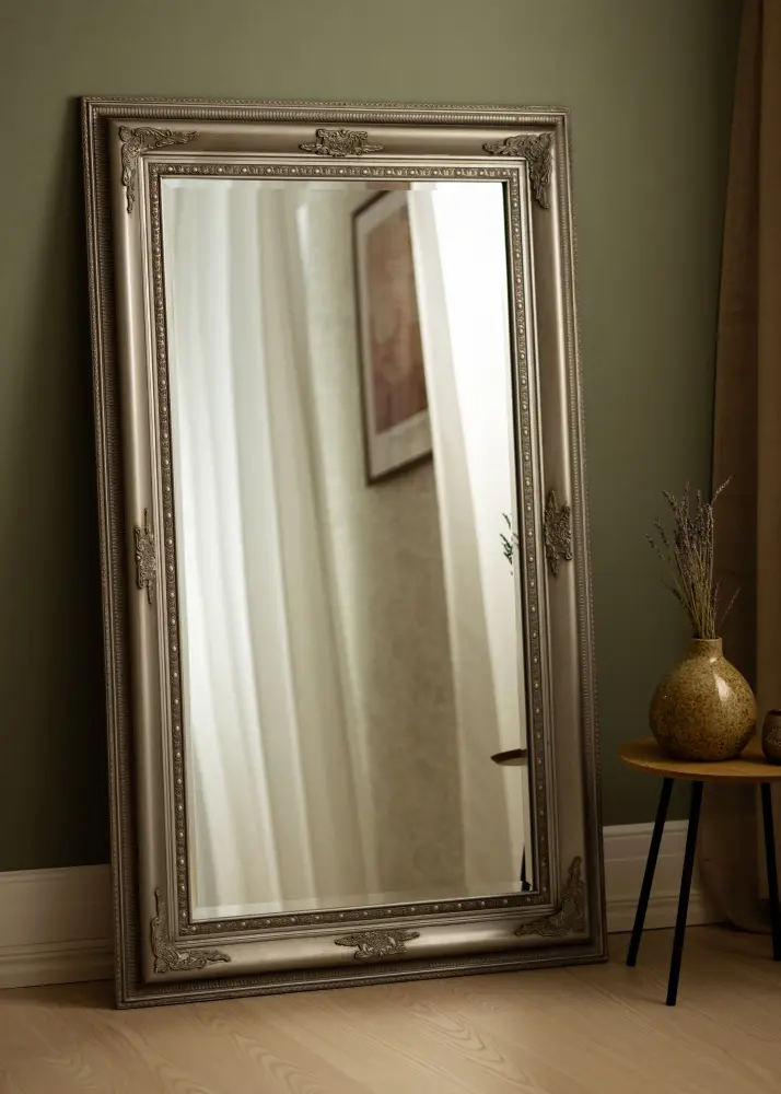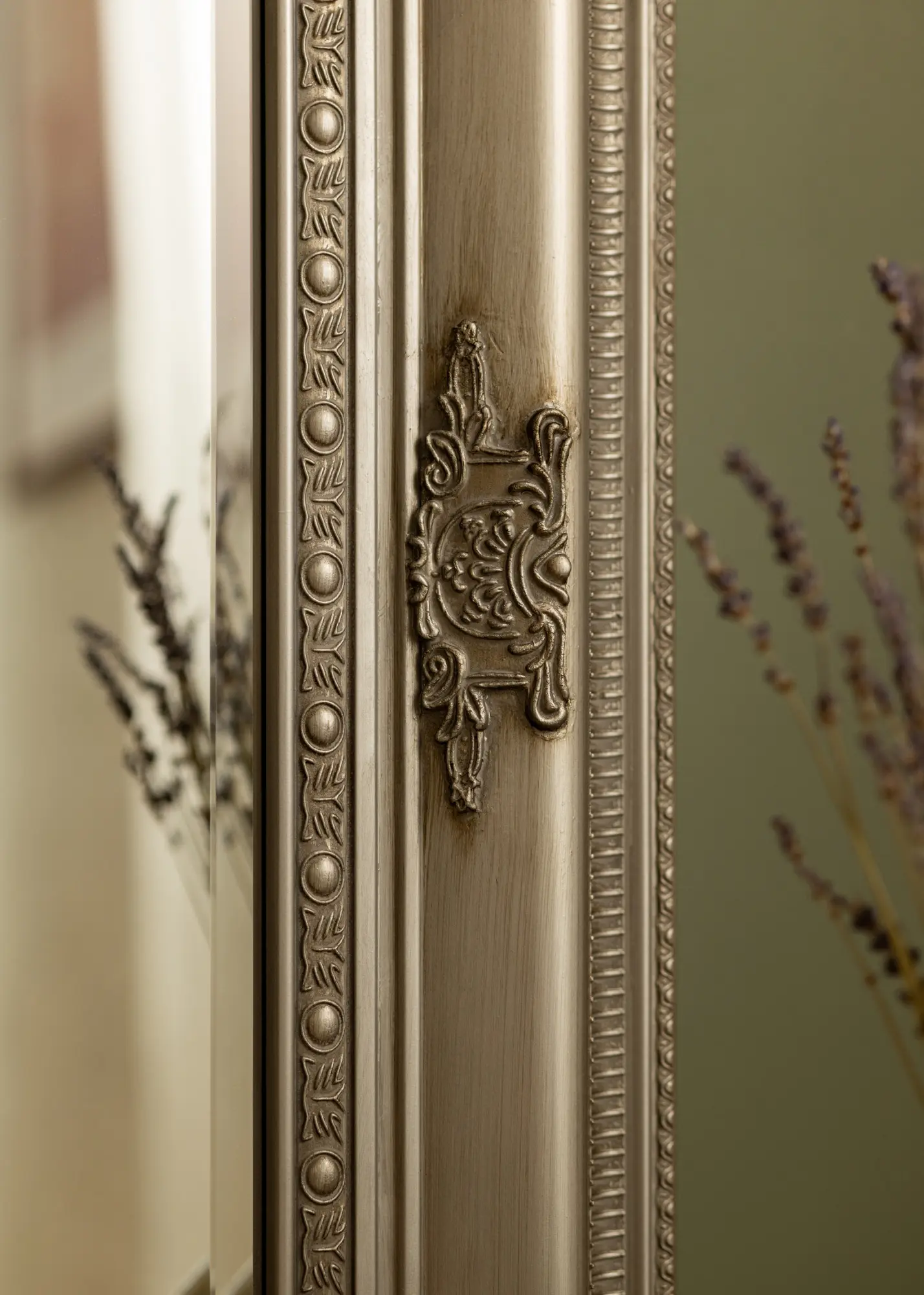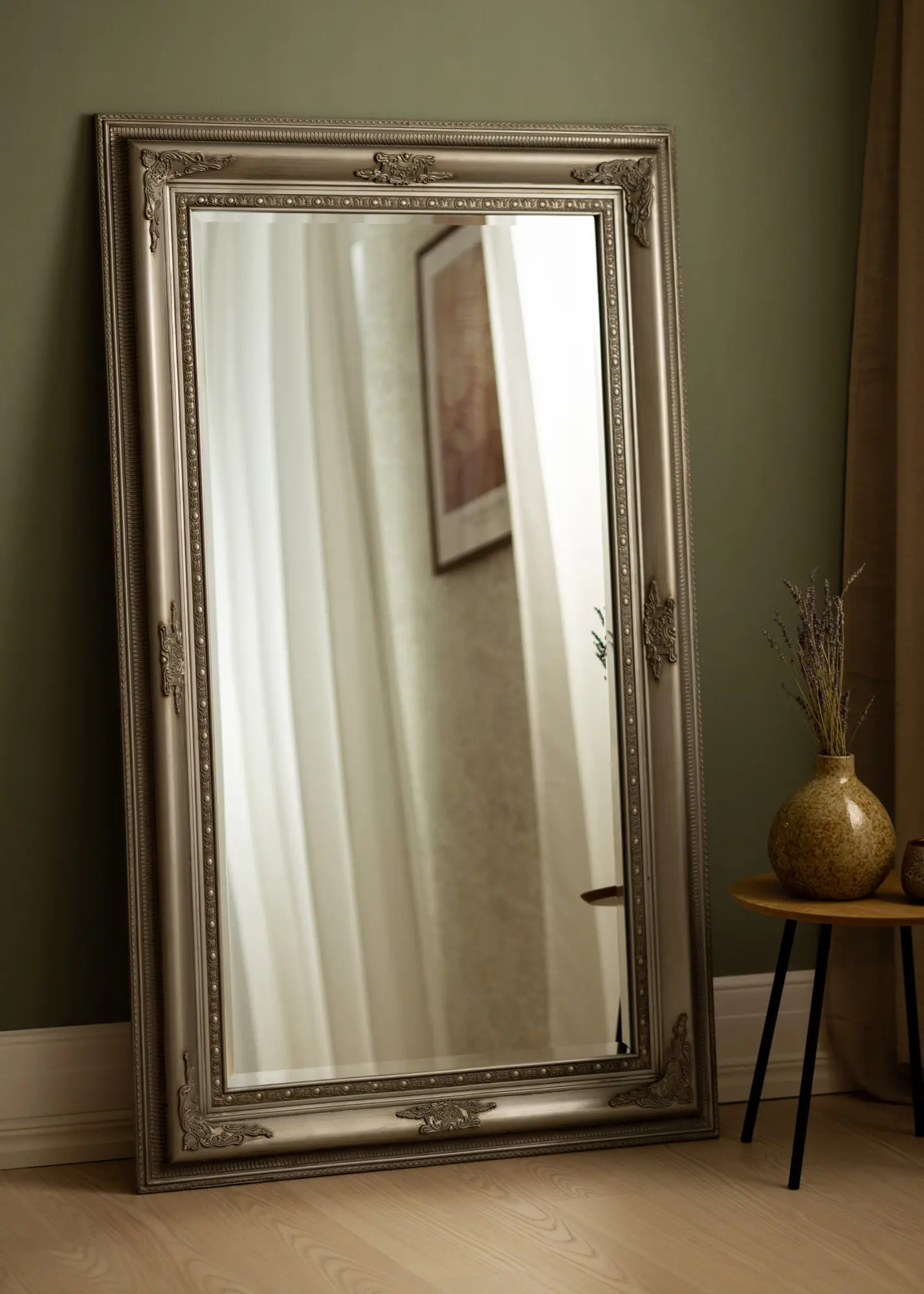 Miroir argenté de style classique avec profil à motifs et ornements floraux tout autour. L'ambiance antique du miroir fait qu'il s'intègre parfaitement dans un intérieur avec des meubles de style, mais il devient également un contraste captivant dans un intérieur moderne et épuré. Le format rend le miroir approprié à la fois dans le hall d'entrée, comme dans le dressing ou sur un mur de la chambre où les vêtements jouent un rôle important dans la décoration d'intérieur. Mettez en valeur le miroir avec des accessoires intérieurs argentés dans la pièce.