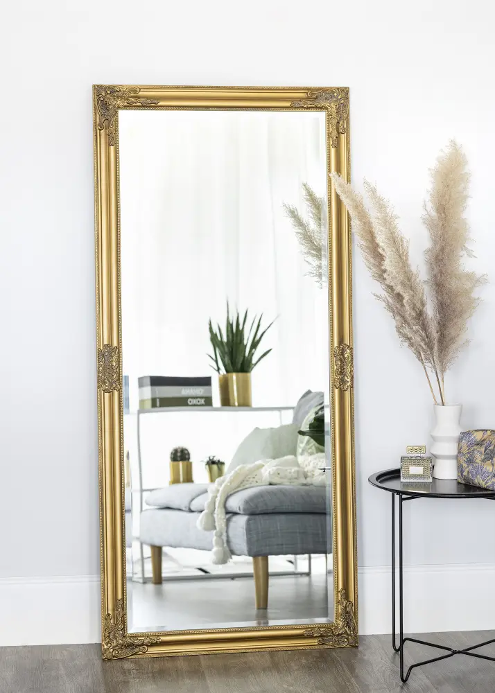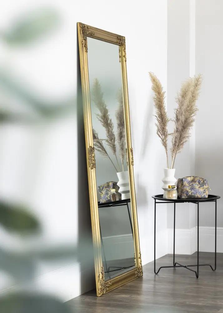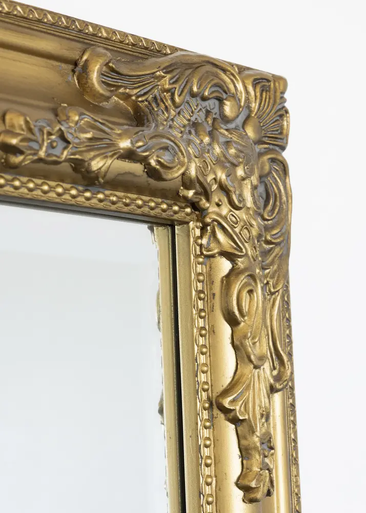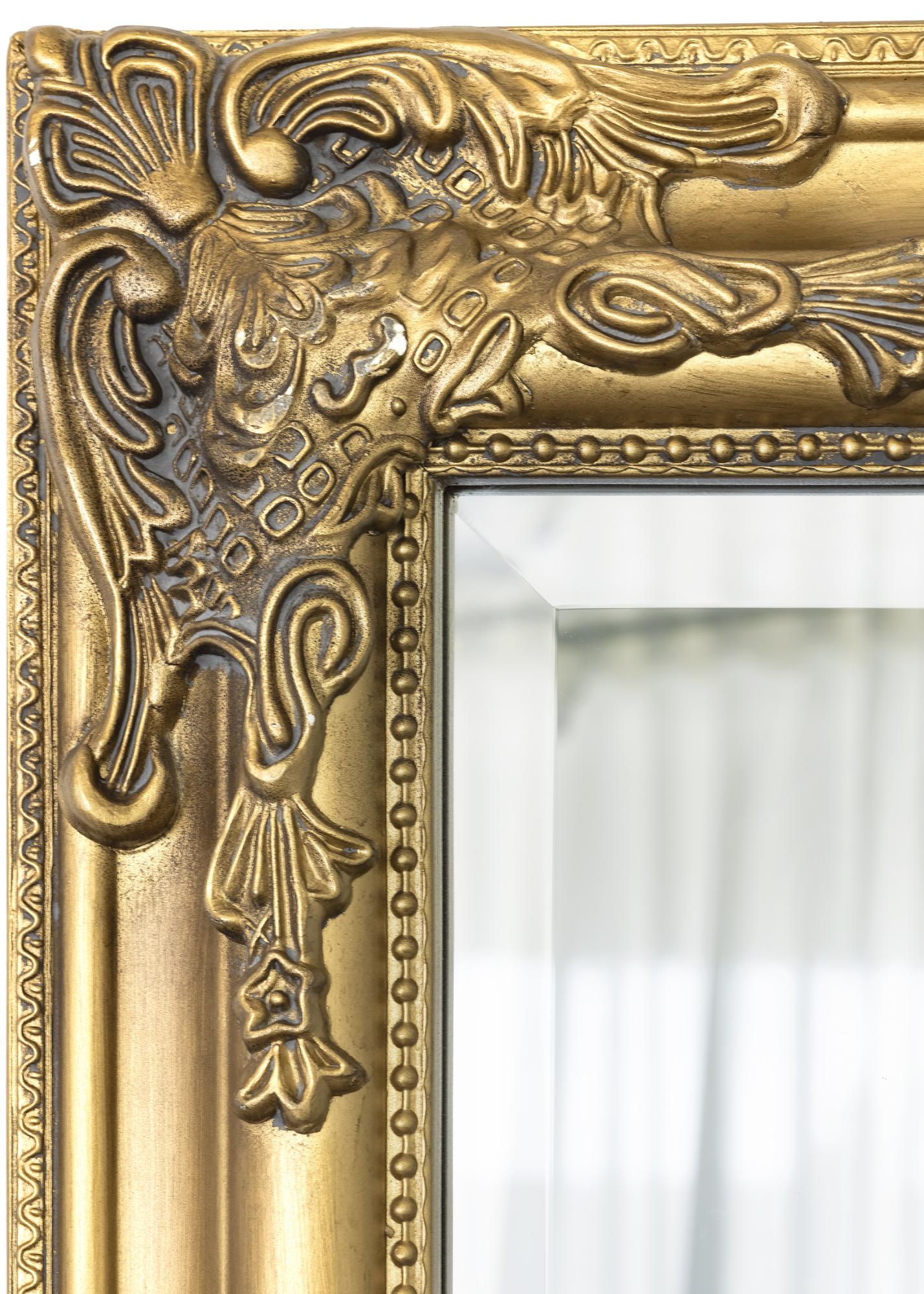 Miroir avec un joli profil de couleur or et un sentiment antique, décoré d'ornements floraux. Le style classique du cadre du miroir fait qu'il s'intègre bien dans les styles d'intérieurs avec des meubles plus anciens, mais il peut également être utilisé pour créer un contraste captivant dans un intérieur contemporain épuré. Le miroir est superbe à accrocher dans le couloir, la chambre ainsi que dans un dressing et se met joliment en valeur avec des accessoires intérieurs dans des tons laiton ou or.