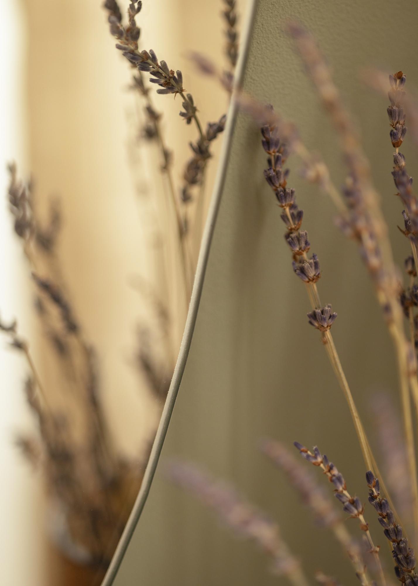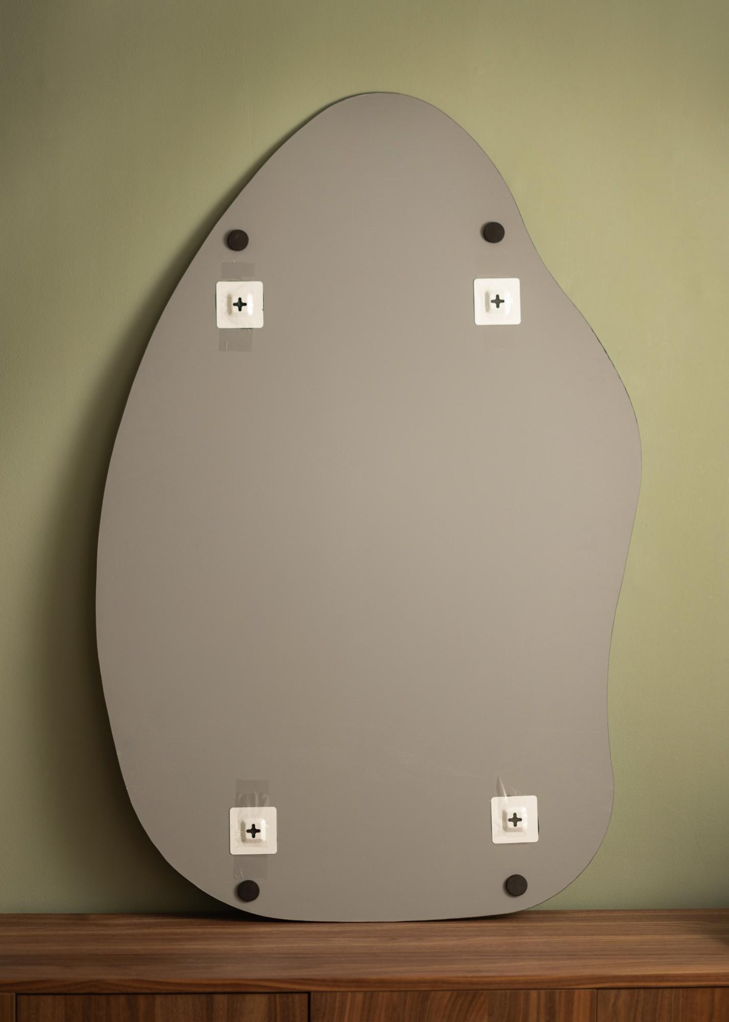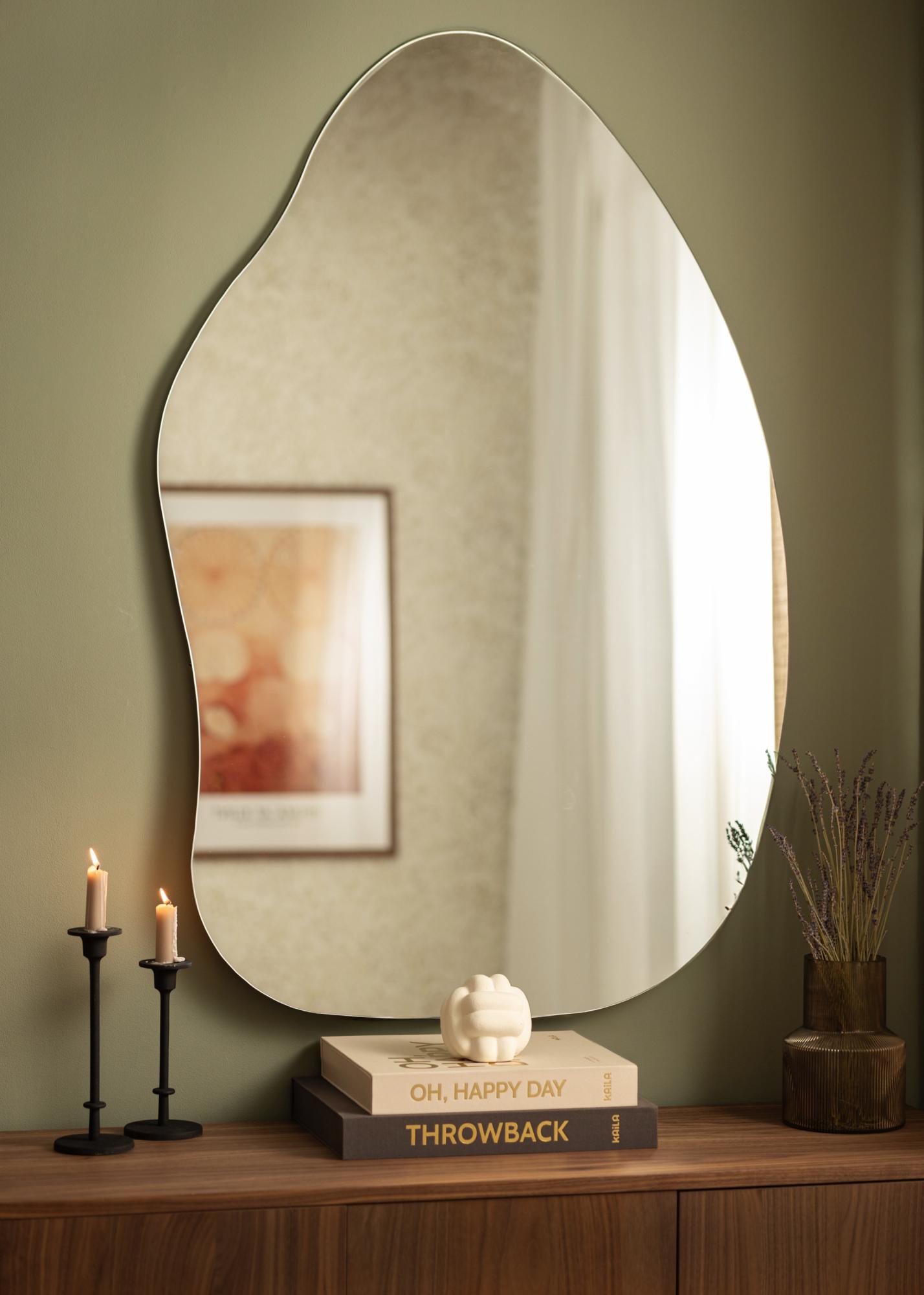 Le miroir a une forme douce et organique rappelant une goutte d'eau ou une feuille dressée, créant une ambiance élégante et moderne dans la pièce. Cette forme unique fait du miroir une conversation à part entière et une oeuvre d'art en soi, tout en remplissant sa fonction pratique.