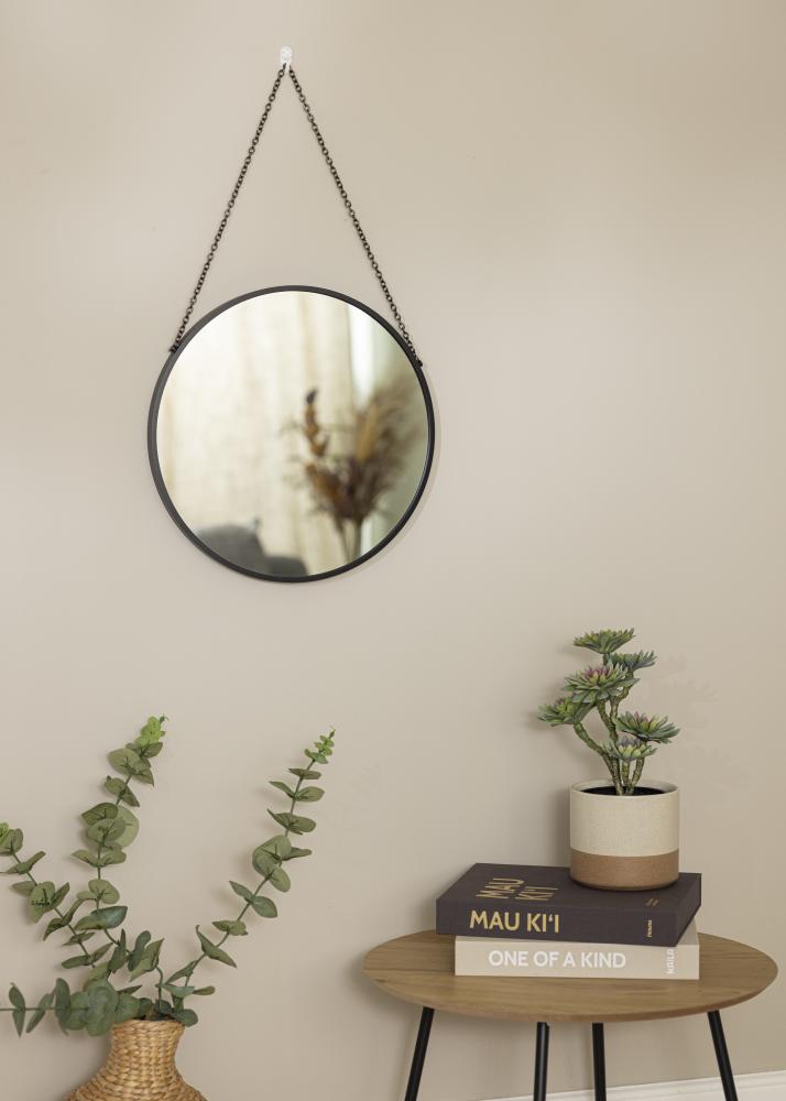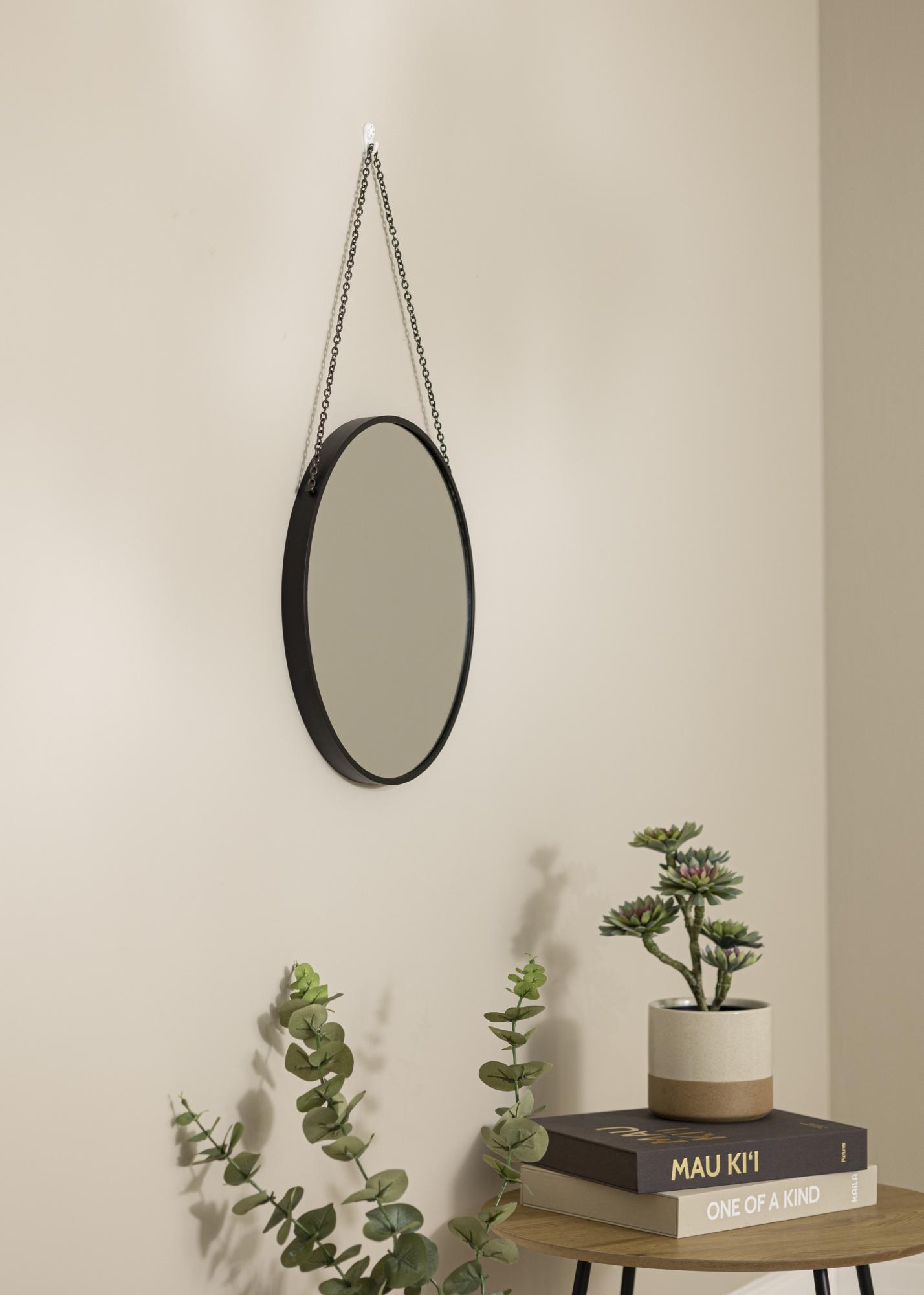 Le miroir rond est un élément d'intérieur classique pour de bonnes raisons ! La forme douce crée une impression d'une grande élégance dans votre maison et rompt avec les lignes droites de votre intérieur. Voici un modèle de miroir rond avec un cadre d'une profondeur de 28 mm et doté d'un joli cadre noir qui peut facilement être assorti aux autres détails décoratifs de votre intérieur. Le cadre du miroir est en métal. Le miroir se suspend au mur grâce à une chaîne noire, ce qui renforce d'avantage son élégance.