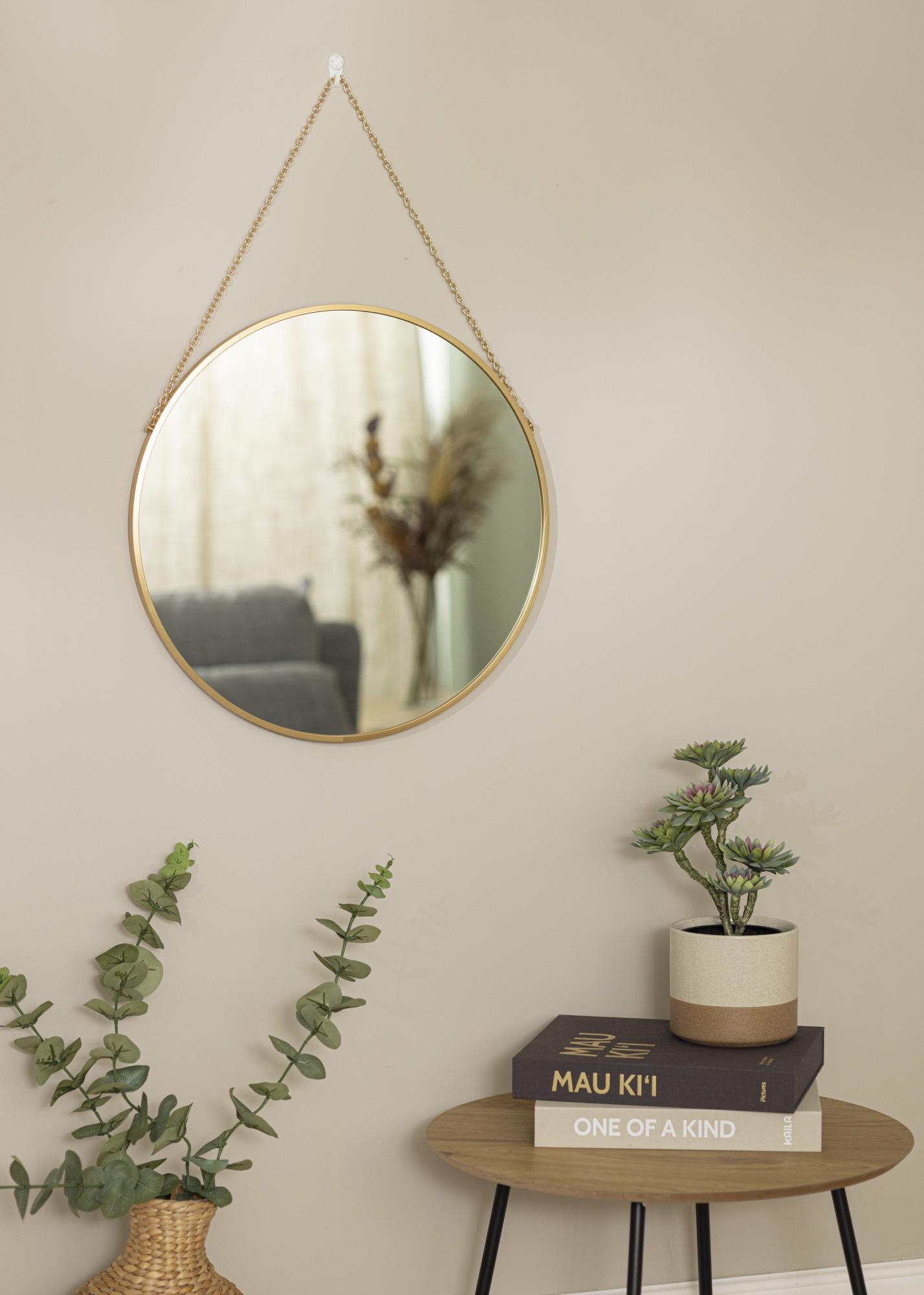Voici un miroir mural qui combine parfaitement fonctionnalité et élégance. Son design est raffiné avec sa forme ronde douce et son cadre d'une profondeur de 28 mm dans une teinte dorée luxueuse. Comme touche finale, le miroir mural se pare d'une jolie chaîne dorée qui permet de l'accrocher.