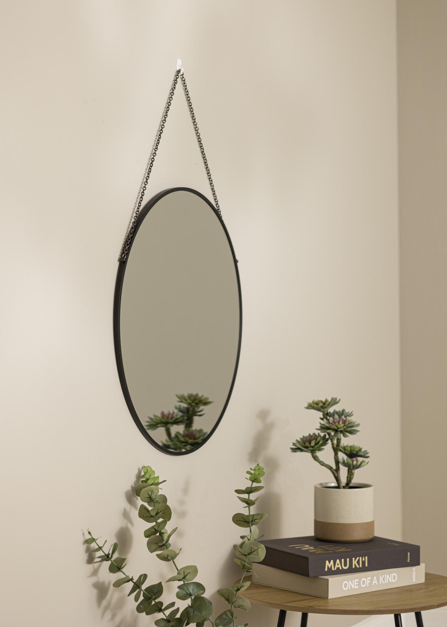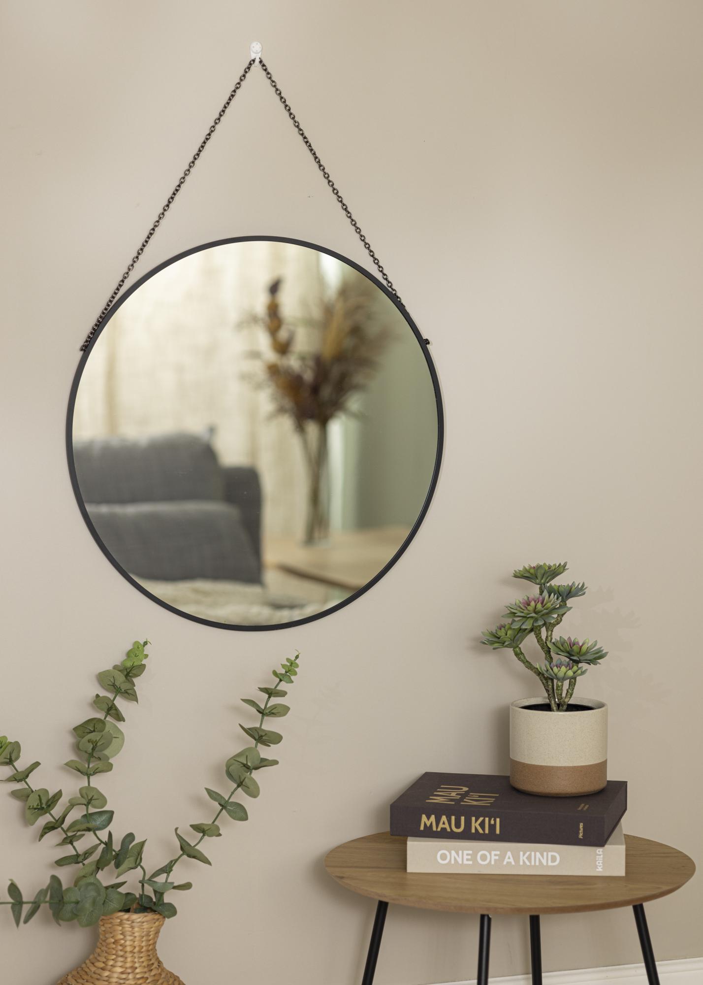 Un miroir qui s'accroche au mur par une chaîne a une prestance particulière, et est très décoratif peu importe la pièce dans lequel il se trouve. Ce miroir mural rond se suspend au mur à l'aide d'une chaîne en métal noir qui s'accorde parfaitement avec le cadre du miroir lui-même en métal noir. Le cadre a une profondeur de seulement 8 mm, ce qui lui donne son apparence soignée et élégante.