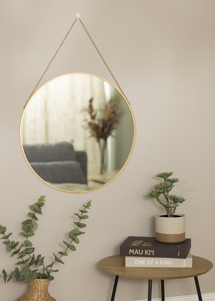 Permettez à ce miroir mural d'ajouter de l'élégance à votre intérieur ! Ce miroir a un aspect sophistiqué avec sa forme ronde et son cadre de miroir tout en finesse d'une profondeur de seulement 8 mm. Son bel encadrement est conçu en métal et se présente dans une teinte or exclusive. L'élégance du miroir est complétée par une chaîne dorée permettant de l'accrocher.