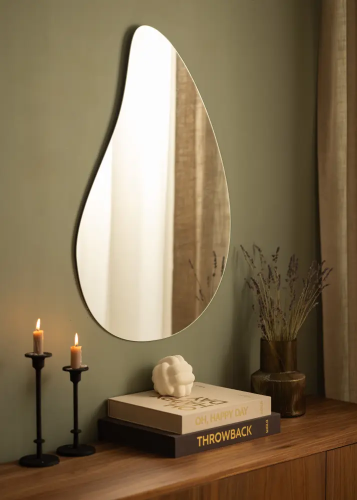 Ce miroir super fin provient du danois Incado et a une surface de miroir de 60x41 cm. La forme en goutte du miroir donne une sensation de fraîcheur à la pièce dans laquelle vous choisissez de l'accrocher et convient à tous ceux qui s'intéressent à la décoration d'intérieure et aux tendances.