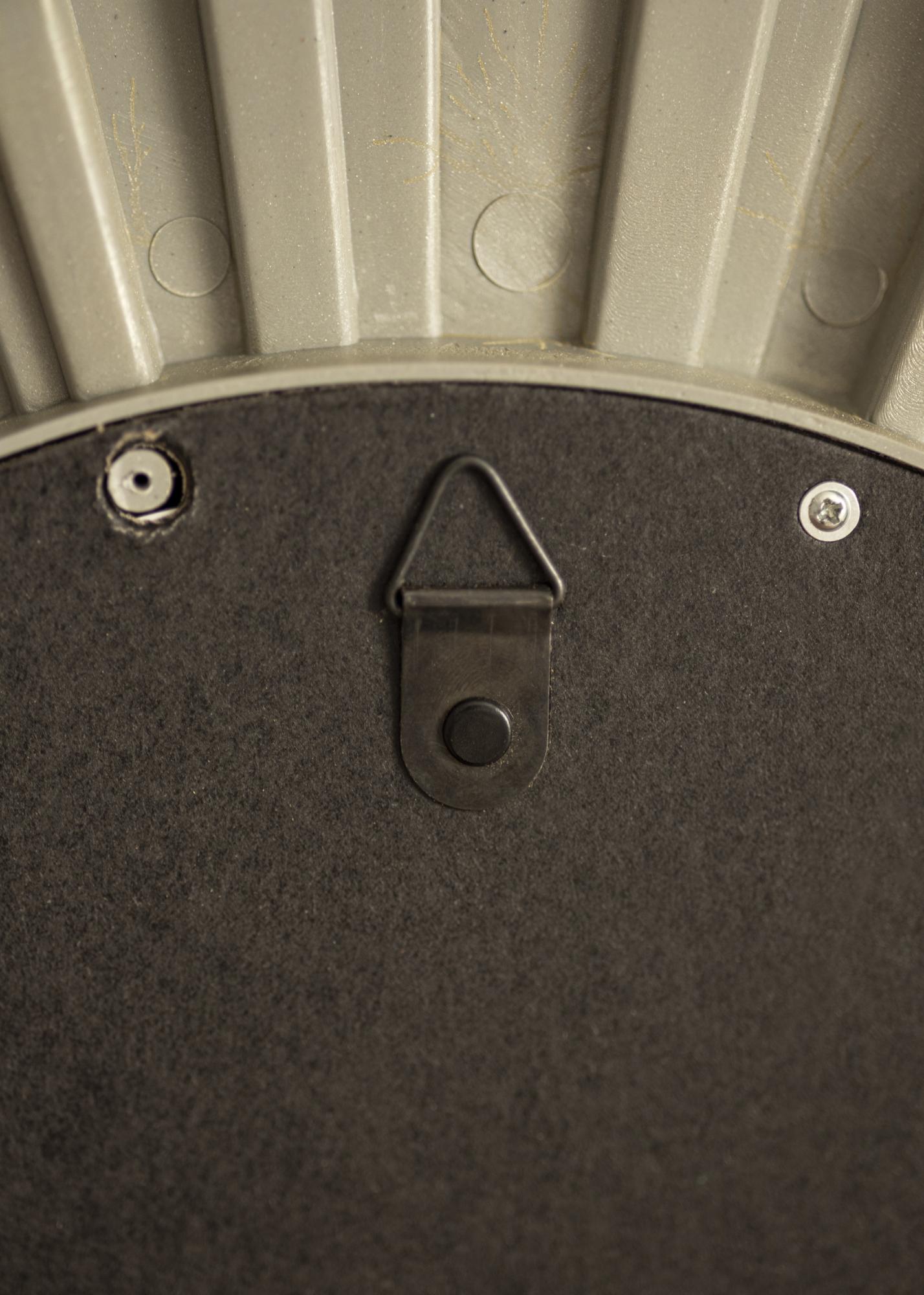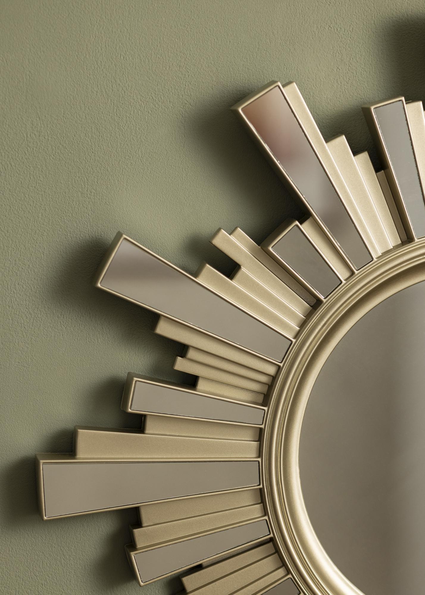 Ce miroir rond a un cadre très décoratif en forme de soleil. Le cadre est de couleur or, ce qui donne au miroir une apparence élégante et nette.