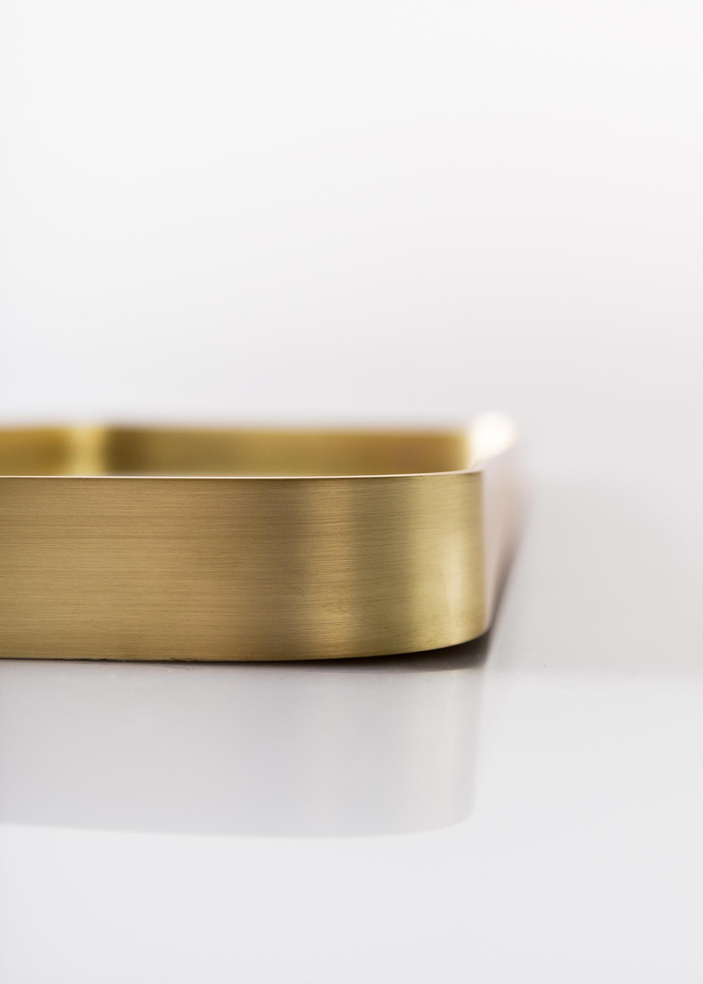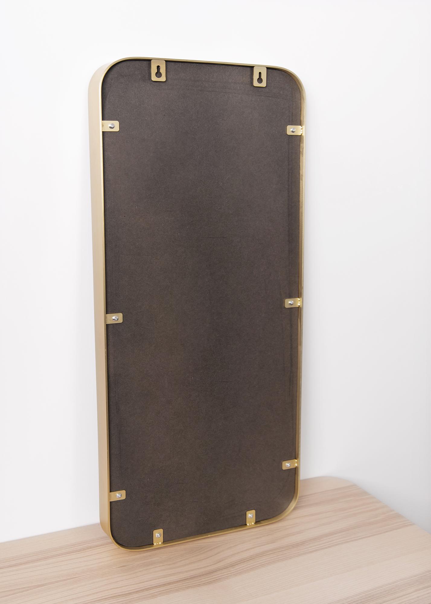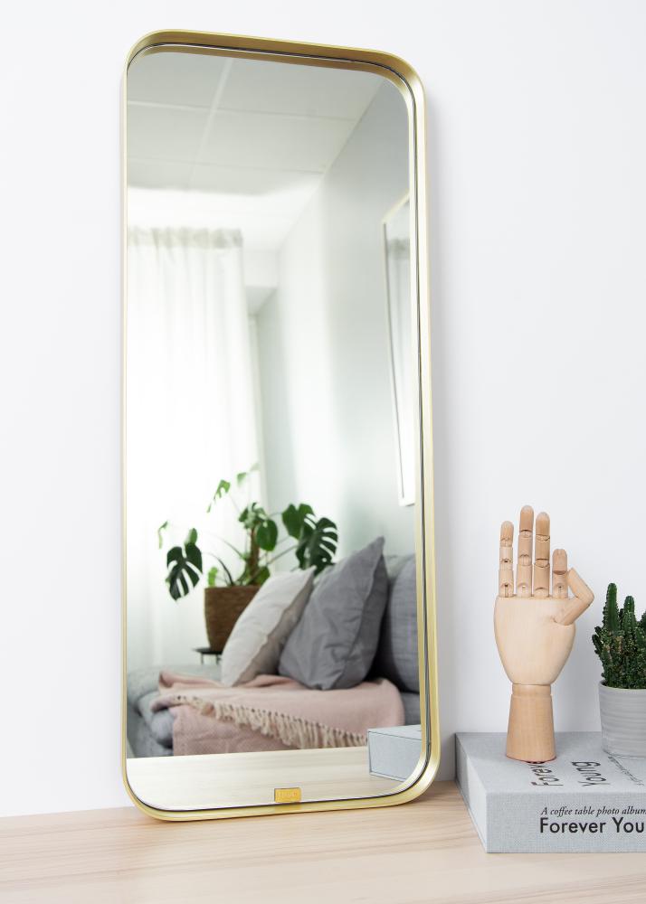 Un miroir rectangulaire dans un design danois épuré. Le cadre a des coins arrondis et est fabriqué en métal avec une finition en laiton, ce qui donne une impression douce et élégante Le miroir peut être fixé au mur ou facilement appuyé contre le mur tout en se tenant sur le bureau ou l'étagère. Cet élégant miroir provient du danois Hübsch.