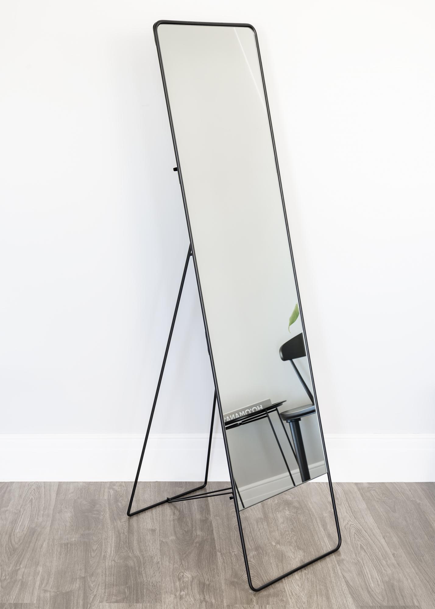 Magnifique miroir sur pied de House Doctor au design intemporel et aux lignes strictes et serrées. Le miroir est en fer peint noir et s'intègre parfaitement dans une décoration scandinave moderne.