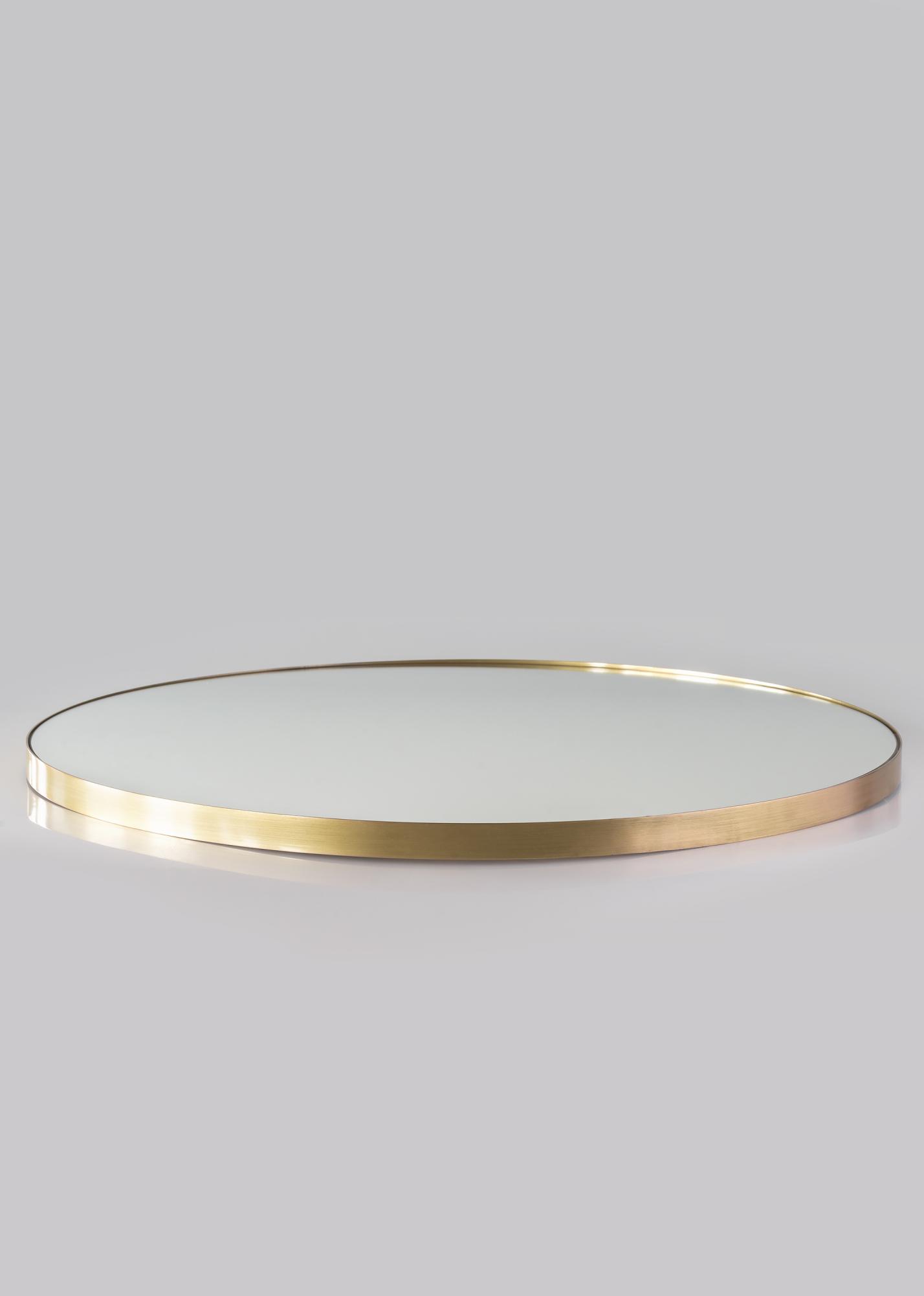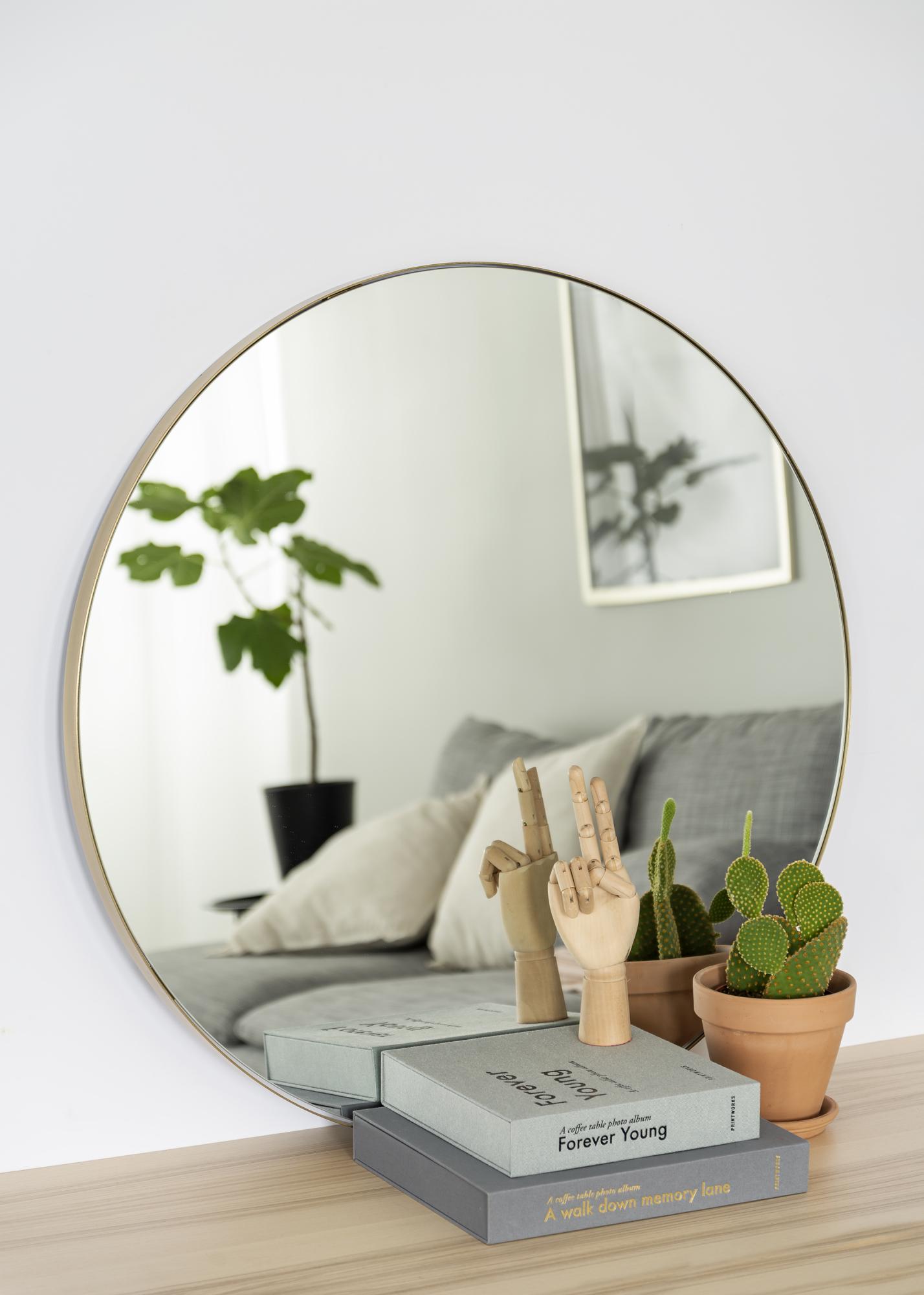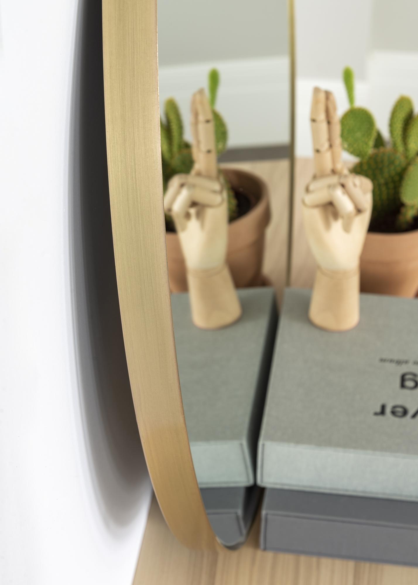 Ce miroir rond est entouré d'un beau cadre en métal couleur laiton. Le miroir donne une impression très élégante et épurée et s'adapte à la fois à la décoration intérieure moderne comme classique.