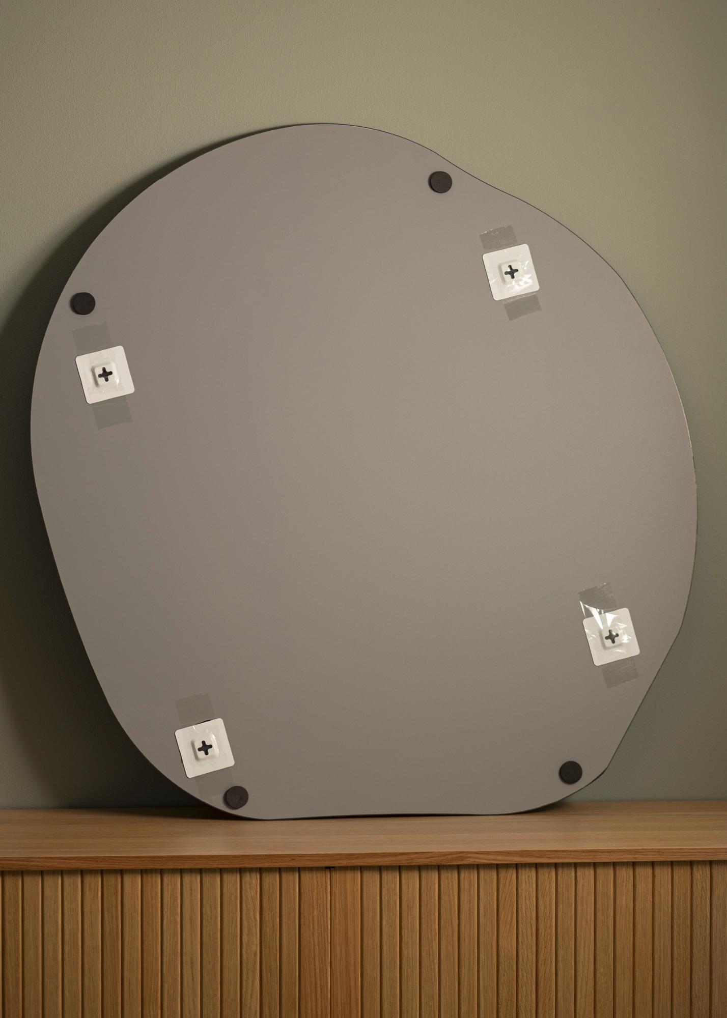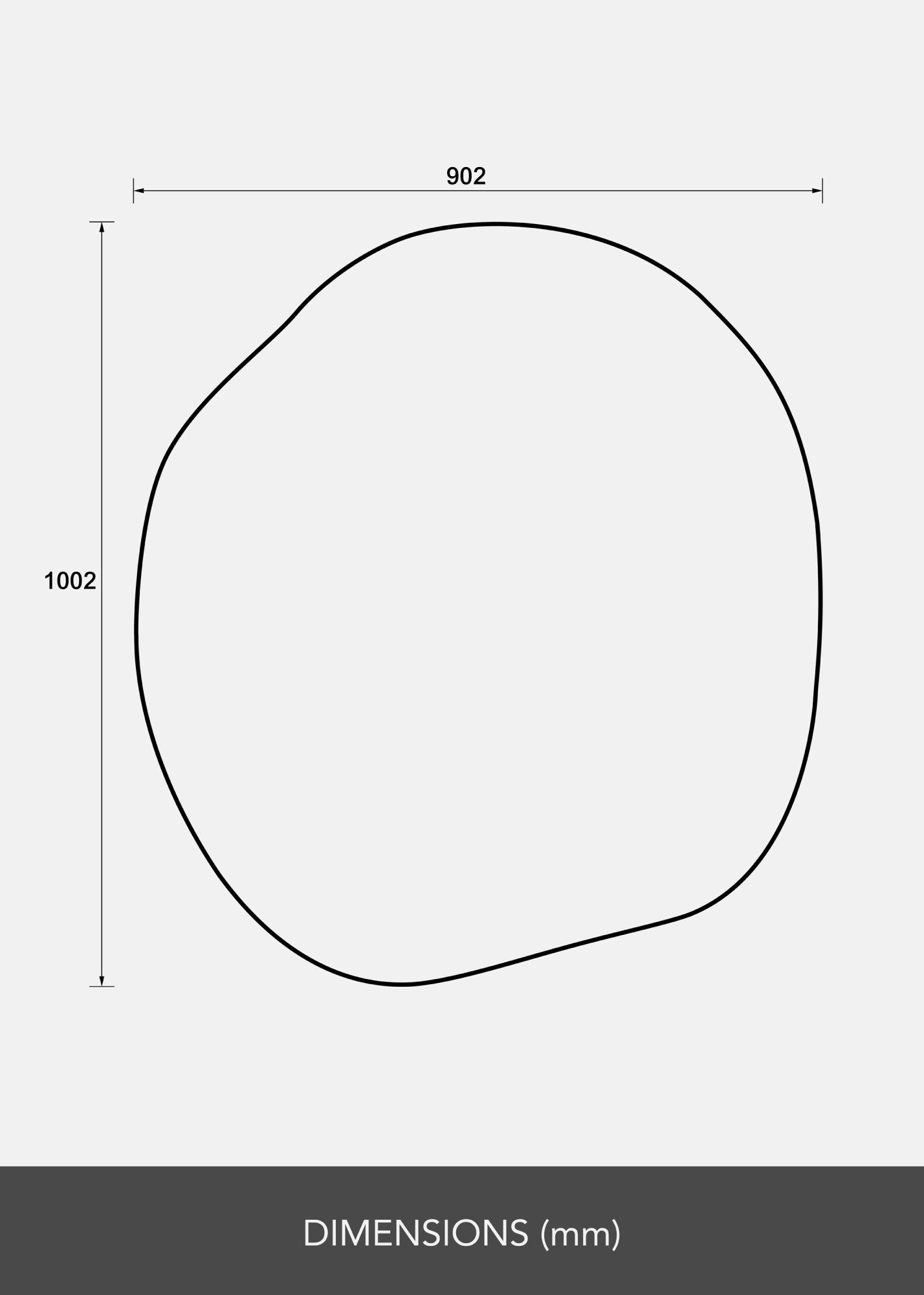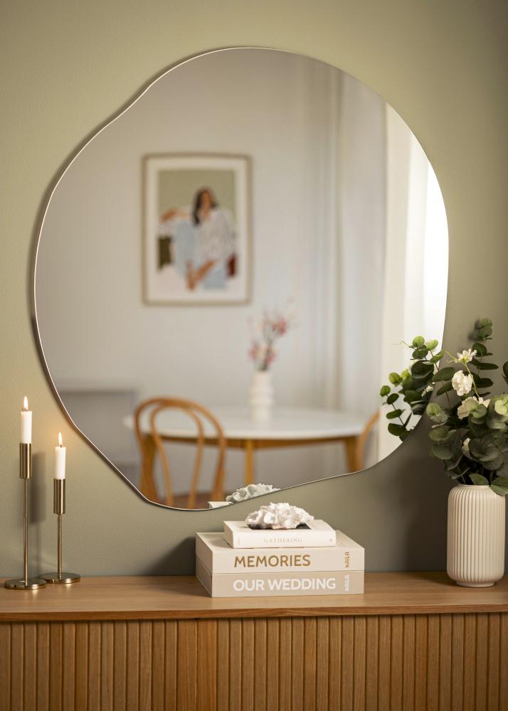 Le miroir a une forme arrondie, presque organique, avec des lignes douces et fluides qui créent une atmosphère détendue et accueillante. Ce design permet au miroir de devenir un point focal naturel dans la pièce et d'ajouter une touche d'élégance et de douceur à votre décoration.