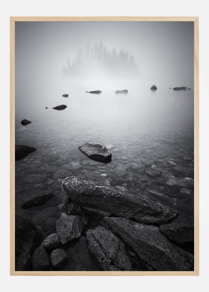 Une affiche de nature mystique représentant des galets et un lac brumeux. Imaginez ce qu'il y a là-bas en observant l'île couverte d'arbres brumeux. Ajoutez une touche de magie dans votre maison avec cette superbe affiche sur un mur bleu.