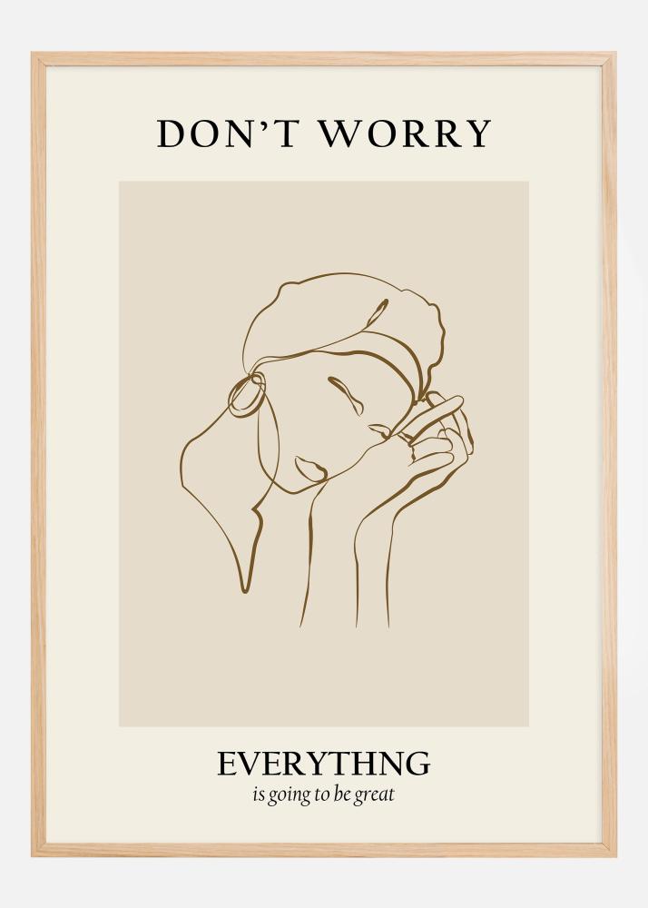 Cette affiche artistique capture un moment de réflexion et de paix intérieure à travers un dessin au trait d'une personne tenant sa main contre son visage. Le texte "DON'T WORRY" en majuscules surplombe l'image et fournit un rappel apaisant, tandis que "EVERYTHING is going to be great" souligne le message avec un ton plus réfléchi. Cette œuvre d'art moderne est parfaite pour créer une sensation de calme et d'optimisme à la maison ou au bureau.