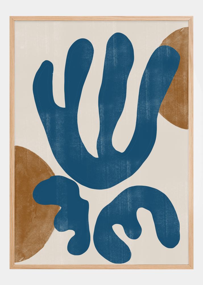 Cette affiche vibrante combine des formes audacieuses et une palette de couleurs terreuses pour créer une sensation à la fois d'art moderne et des merveilles de la nature. Les grandes formes bleues et ondulantes évoquent des pensées d'eau ou de végétation, tandis que les détails ocres ajoutent un contraste chaleureux et naturel. Ce design est un excellent exemple de la façon dont l'art abstrait peut imiter et rendre hommage aux motifs organiques de notre environnement.