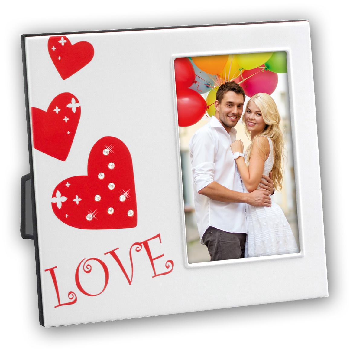 Cadre en métal orné de cœurs rouges et du texte Love avec de la place pour y mettre une photo au format 10x15 cm. Un cadre qui fera ressortir de manière optimale vos photos préférées.