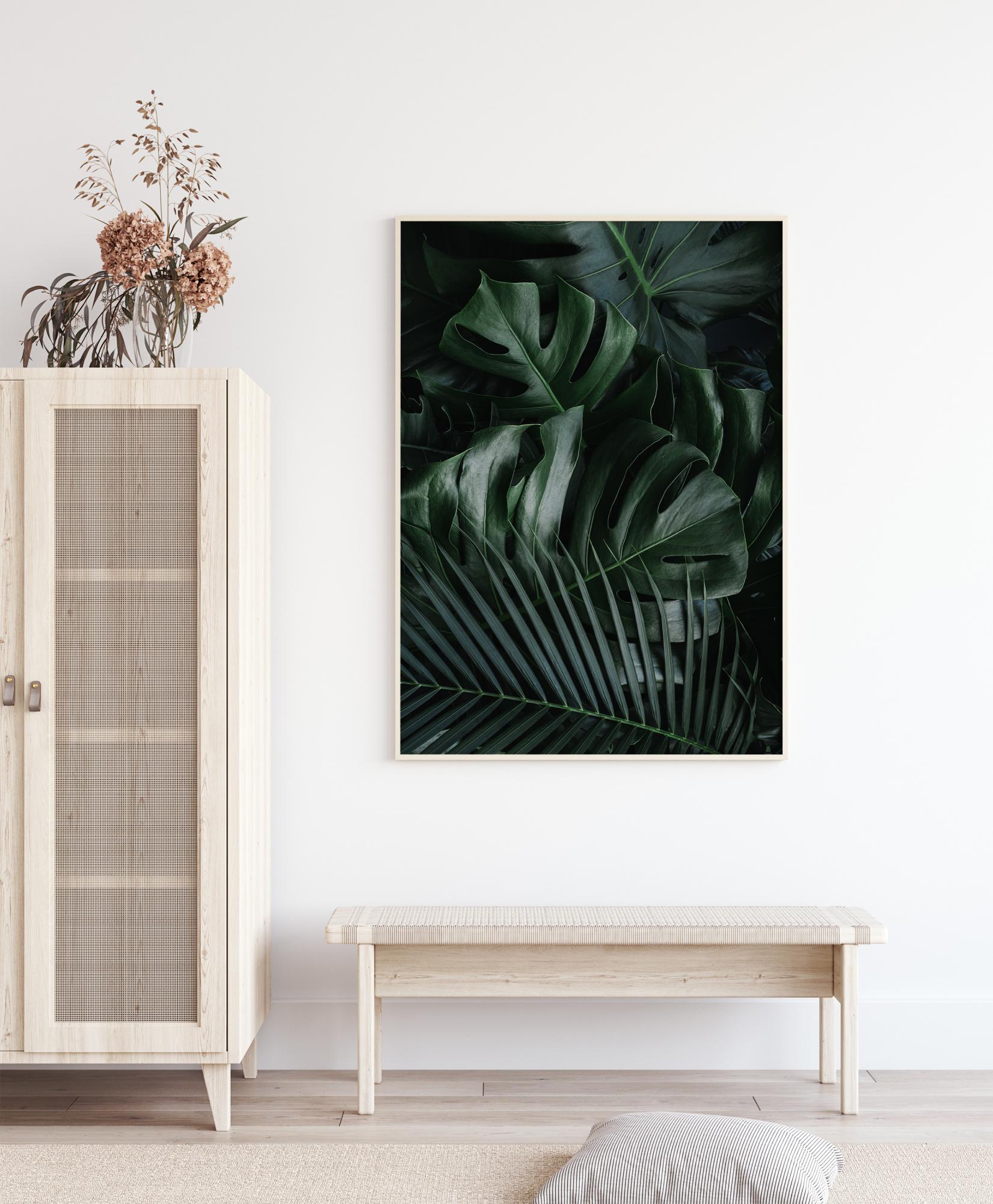 Une affiche feuille de Monstera verte et de feuilles de palmier. La lumière naturelle éclaire la partie supérieure des feuilles de Monstera, créant des nuances plus sombres. L'ensemble des feuilles en forme de scie crée une sensation de chaleur et de détente. Une impression parfaite pour tous ceux qui aiment les plantes.