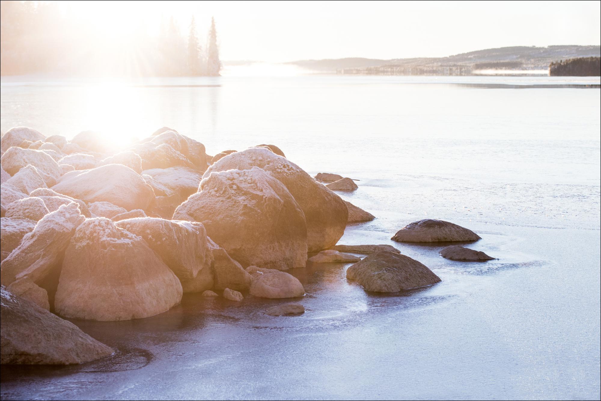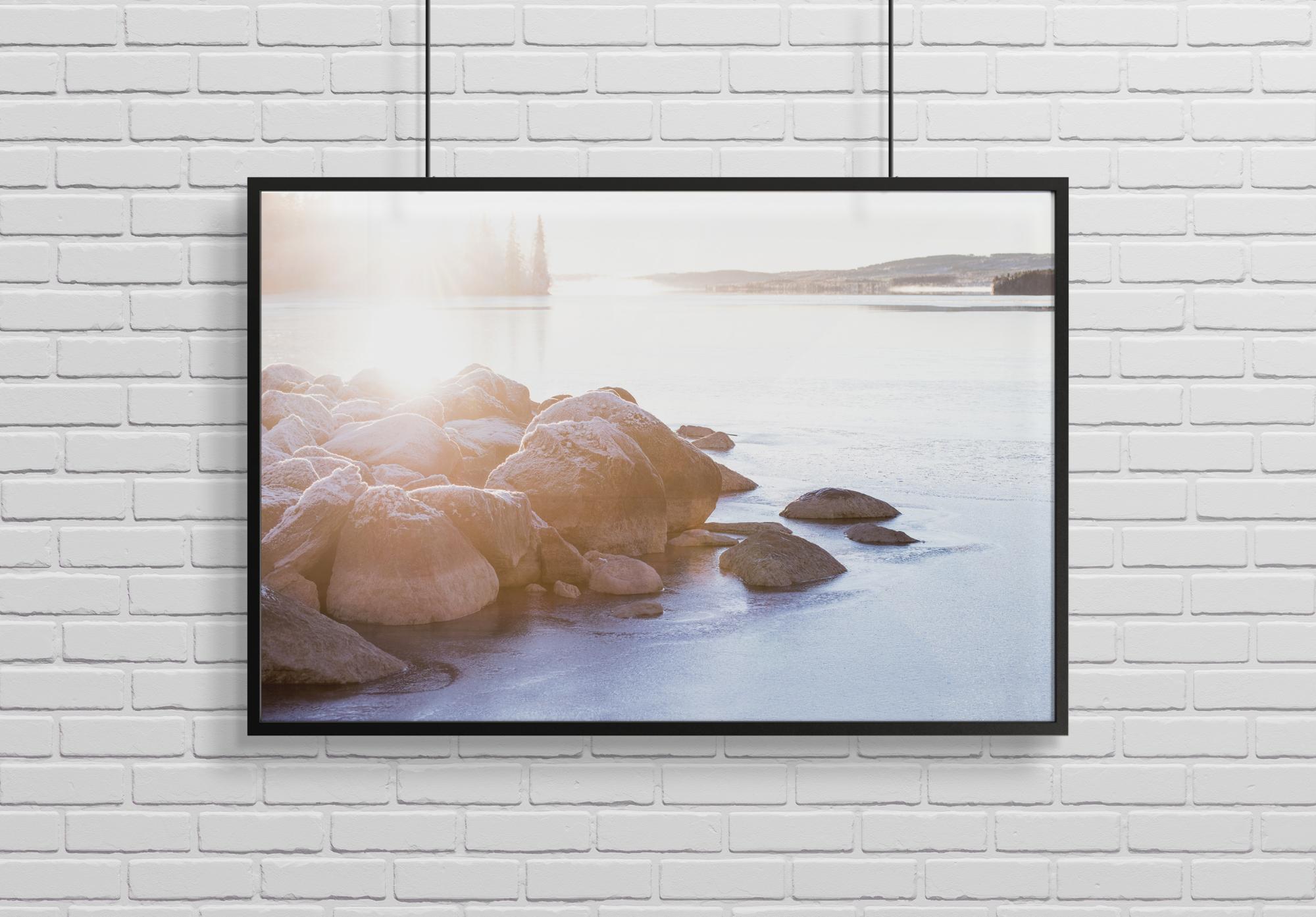 Une affiche de paysage éblouissante représentant des rochers de bord de mer au petit matin. Les eaux de la mer reflètent la lumière du soleil à travers les rochers bruns, créant une surface blanche. Avec les basses terres en arrière-plan, ce tirage illuminera votre salon.