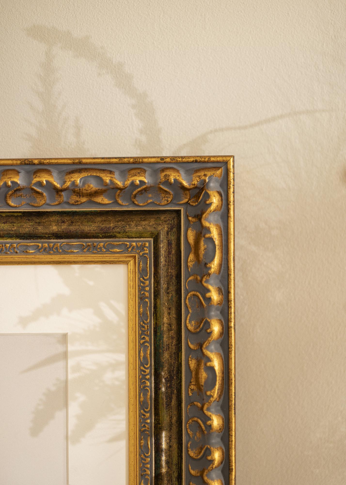 Vous souhaitez composer un beau tableau avec une vieille photo de vos ancêtres ou une jolie photo de votre famille ? Nous avons pour vous un cadre luxueux plein de caractère qui attirera l'attention ! Ce cadre d'une superbe patine est orné de motifs qui passent de l'or au gris ou de l'or au vert et au marron. Comme il est produit dans notre propre atelier de fabrication de cadres, vous êtes assuré d'obtenir un magnifique cadre photo de haute qualité.