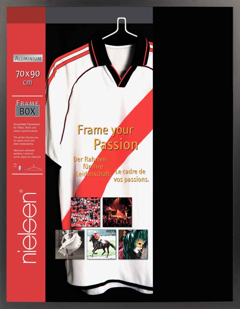 Encadrez votre maillot afin qu'il soit visible dans votre maison ! Il s'agit peut-être d'un tee-shirt de concert, d'un maillot de sport, ou le premier vêtement de votre enfant et vous souhaitez le conserver de manière agréable ? Alors un cadre pour maillot Frame Box mesurant 70x90 cm est idéal ! C'est un cadre noir mat fabriqué en aluminium avec du véritable verre. La baguette de cadre mesure 22 mm de largeur et 65 mm de profondeur.