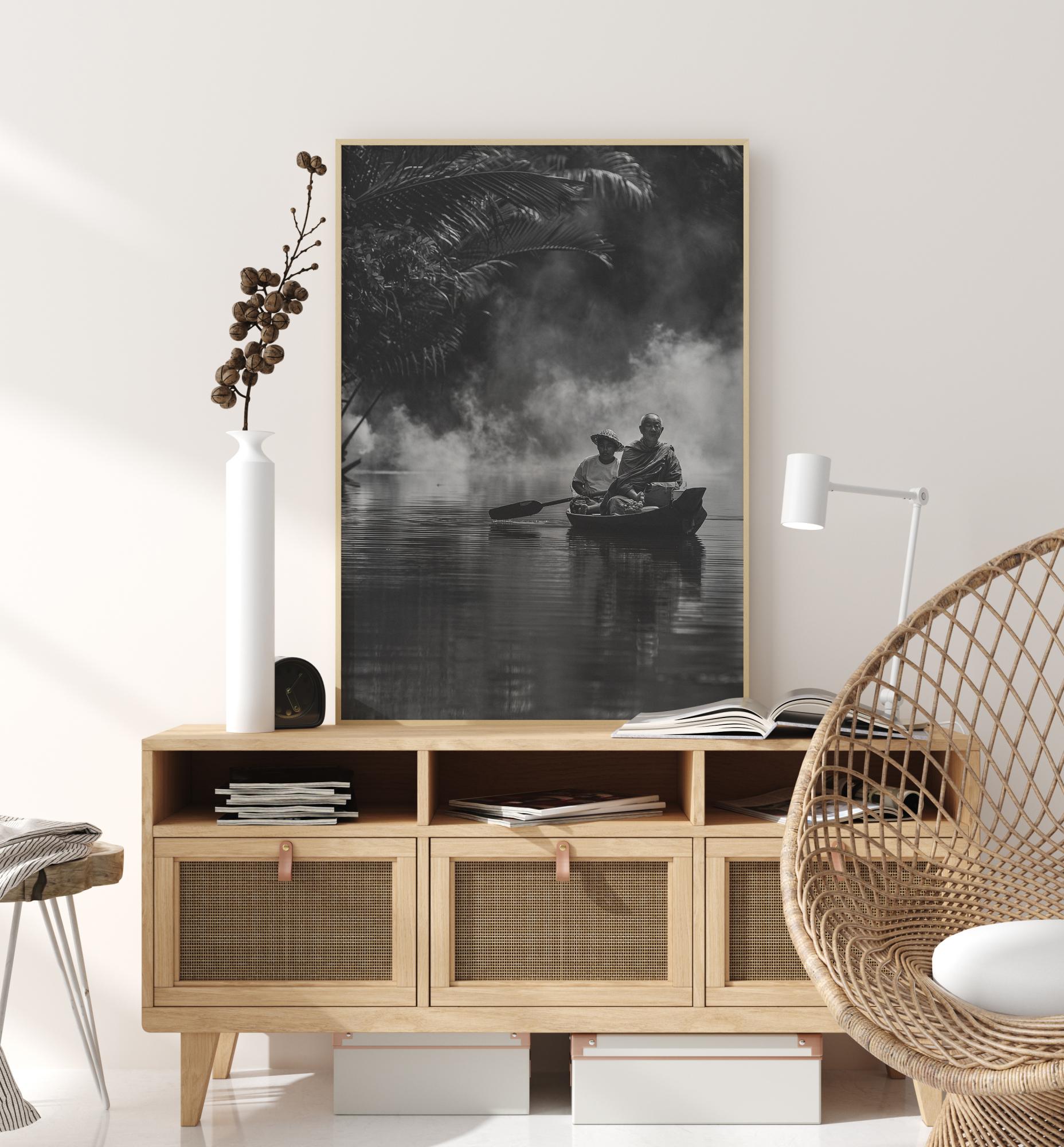 Une paisible photo en gros plan en noir et blanc de deux hommes descendant une rivière. Assis paisiblement sur leur gondole de pêche thaïlandaise, les deux hommes semblent observer leur environnement. La lumière naturelle du soleil qui brille à travers les nuages reflète le bateau sur l'eau. Vous pouvez presque entendre le silence de cette affiche. Parfait pour un environnement calme.