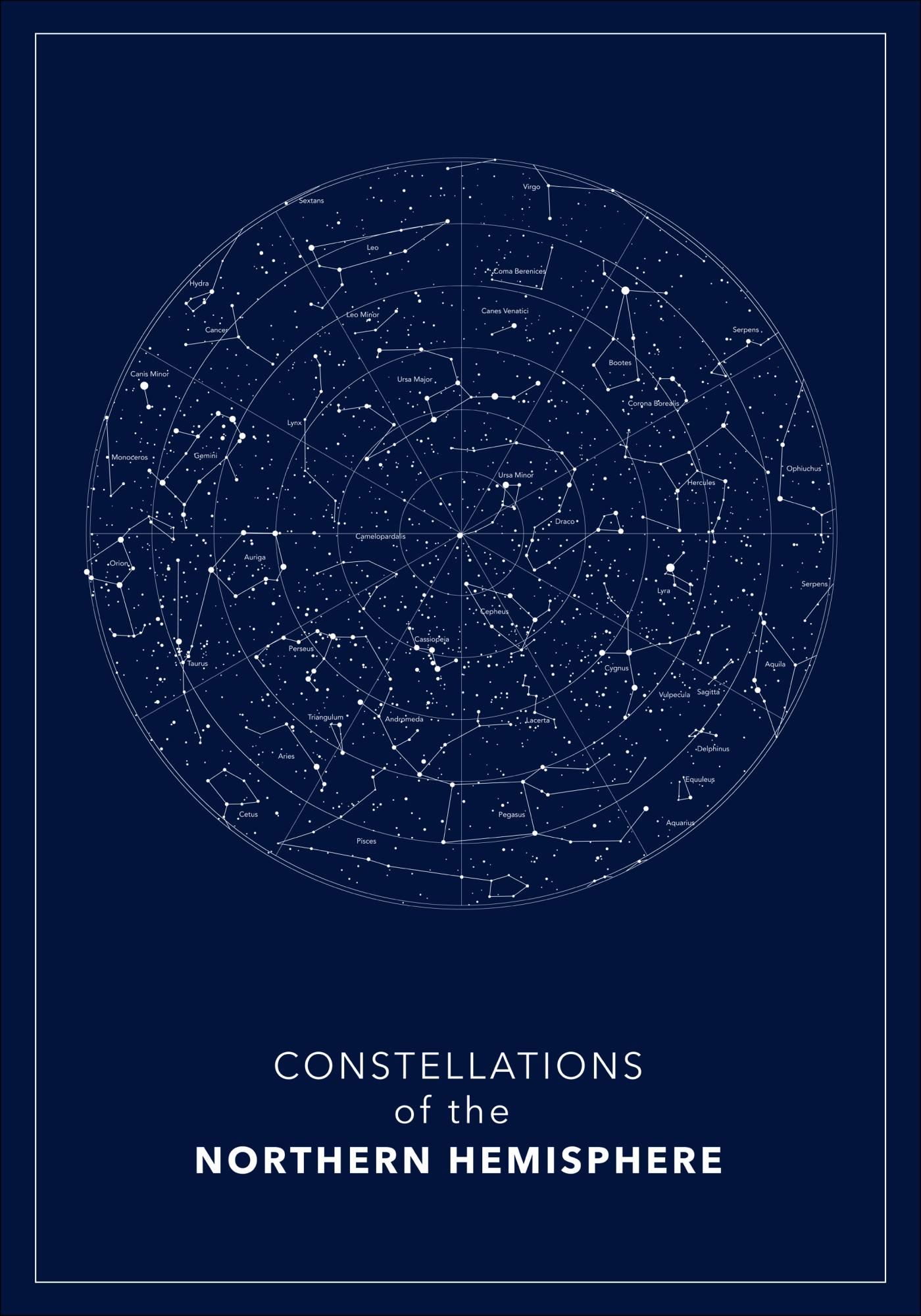 Une affiche scintillante d'un cercle blanc avec les constellations de l'hémisphère nord. Les constellations sont mises en évidence par une légère ligne blanche avec le nom écrit sous chacune d'elles. Sur un fond bleu foncé, il s'agit d'une explication très claire de l'hémisphère nord. Une impression idéale à accrocher dans un studio.