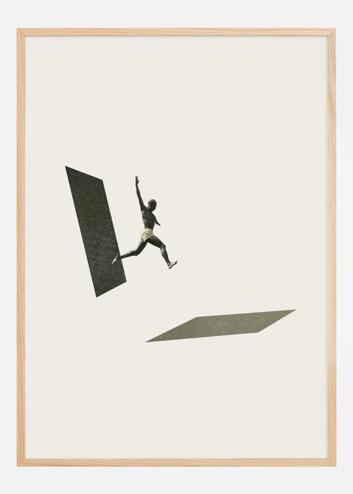 Ce poster captivant et inspirant représente une personne sautant d'une porte ouverte vers un avenir incertain symbolisé par une plateforme ombragée. L'image peut être interprétée comme une métaphore du courage de faire le saut vers l'inconnu ou de ne pas hésiter devant de nouveaux défis. La posture dynamique de la personne et le saut puissant illustrent un sentiment de détermination et d'élan en avant.