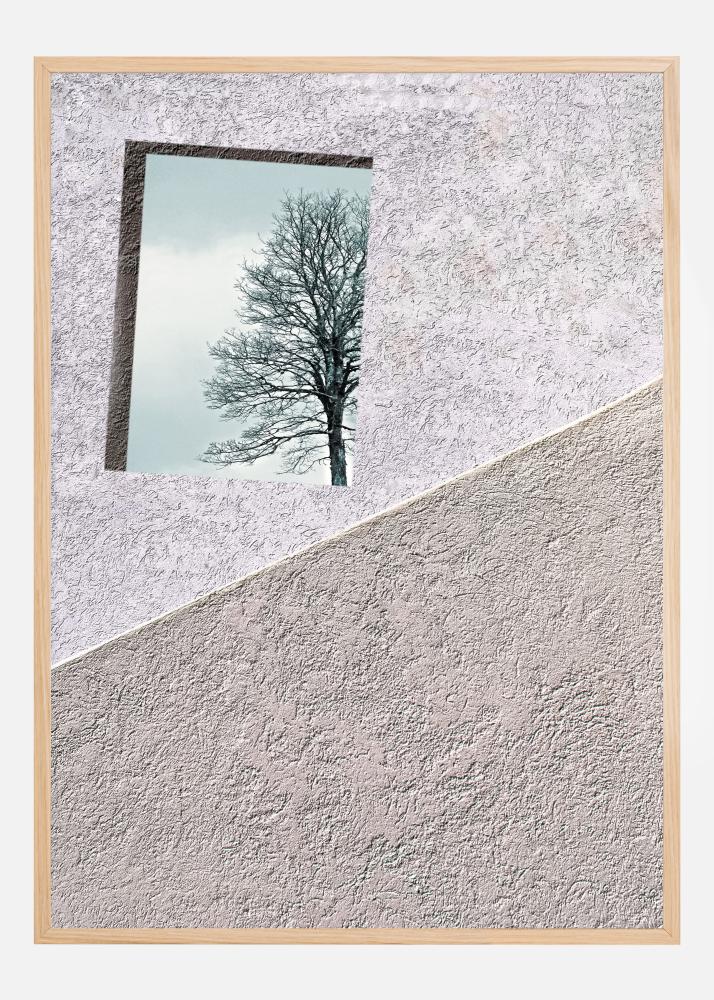 Une affiche délicate d'un mur rose et brun. Le mur crépi brut est divisé en deux parties, Sur le côté rose du mur, vous pouvez voir un ciel bleu nuageux avec un arbre au premier plan, tandis que le mur brun est nu. Une image créative pour toute maison moderne.