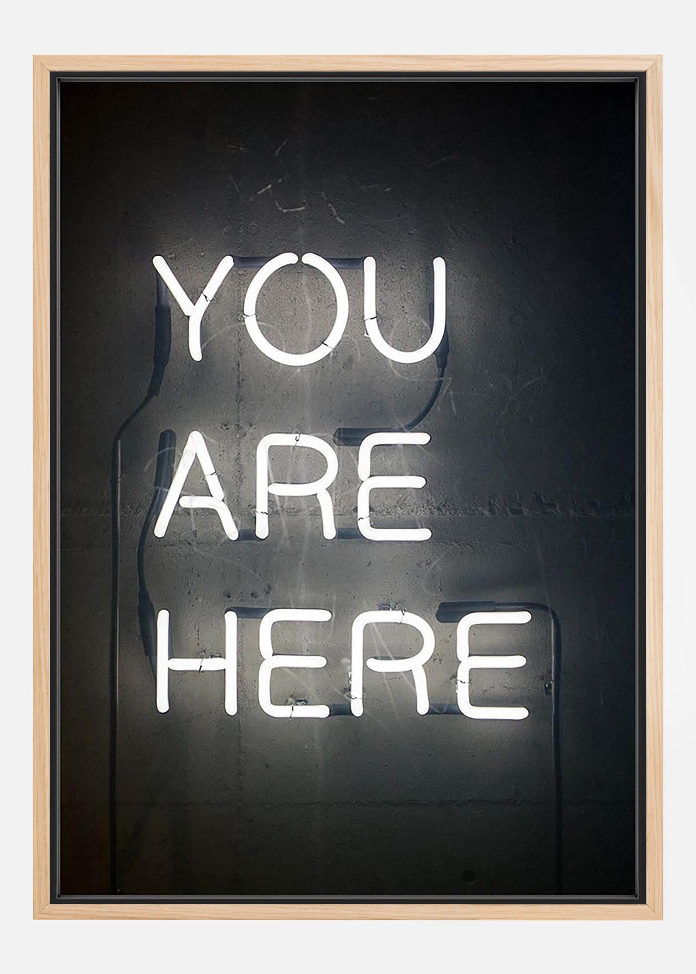 Un poster en noir et blanc d'une enseigne au néon avec le texte informatif "You are here". Une image simple et élégante avec une touche d'humour agréable, parfaite à combiner avec d'autres de nos fantastiques motifs sur un plus grand mur de posters.