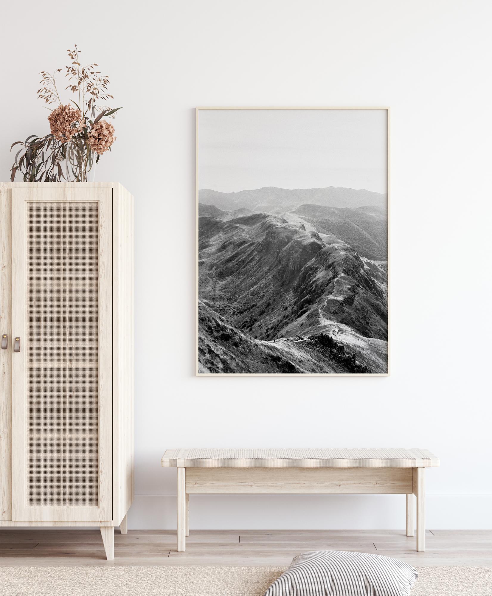 Impression en noir et blanc d'une chaîne de montagnes. Les différentes nuances de gris se fondent parfaitement les unes dans les autres. Sans aucun signe de végétation ou de vie, vous pouvez presque entendre le silence au sommet des montagnes. Accrochez cette affiche sur un mur coloré et écoutez le vent souffler.