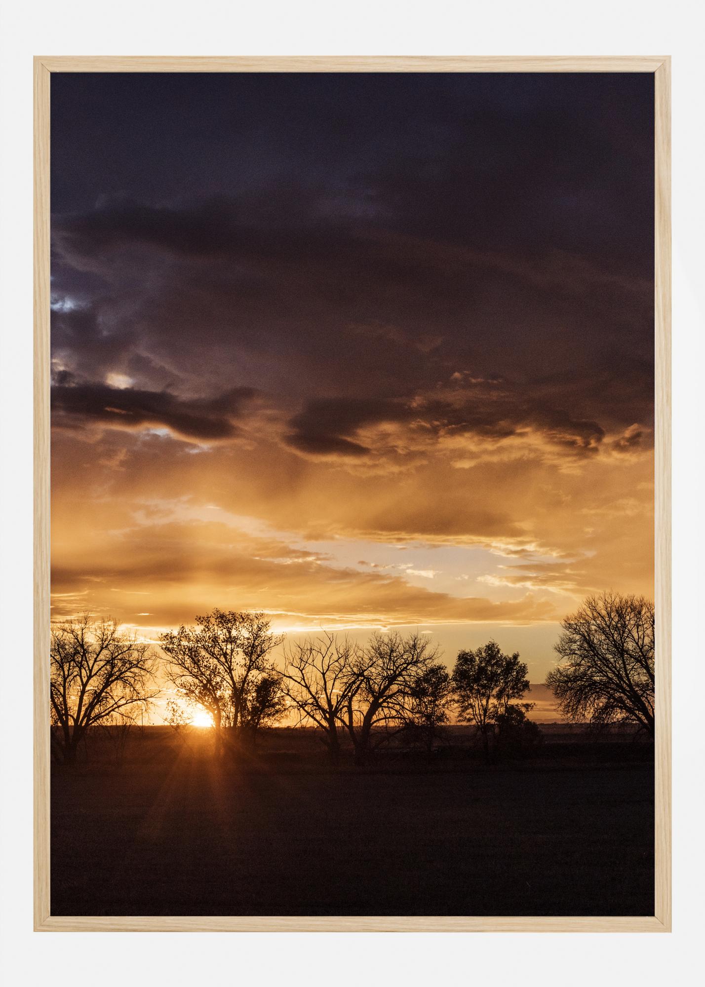 Une affiche époustouflante d'un coucher de soleil orange. Le coucher de soleil à l'horizon met en valeur les arbres d'automne dans les champs. Avec un ciel spectaculaire, les nuances d'orange créent une atmosphère chaleureuse et apaisante. Un poster étonnant pour apporter de la chaleur dans votre salon.