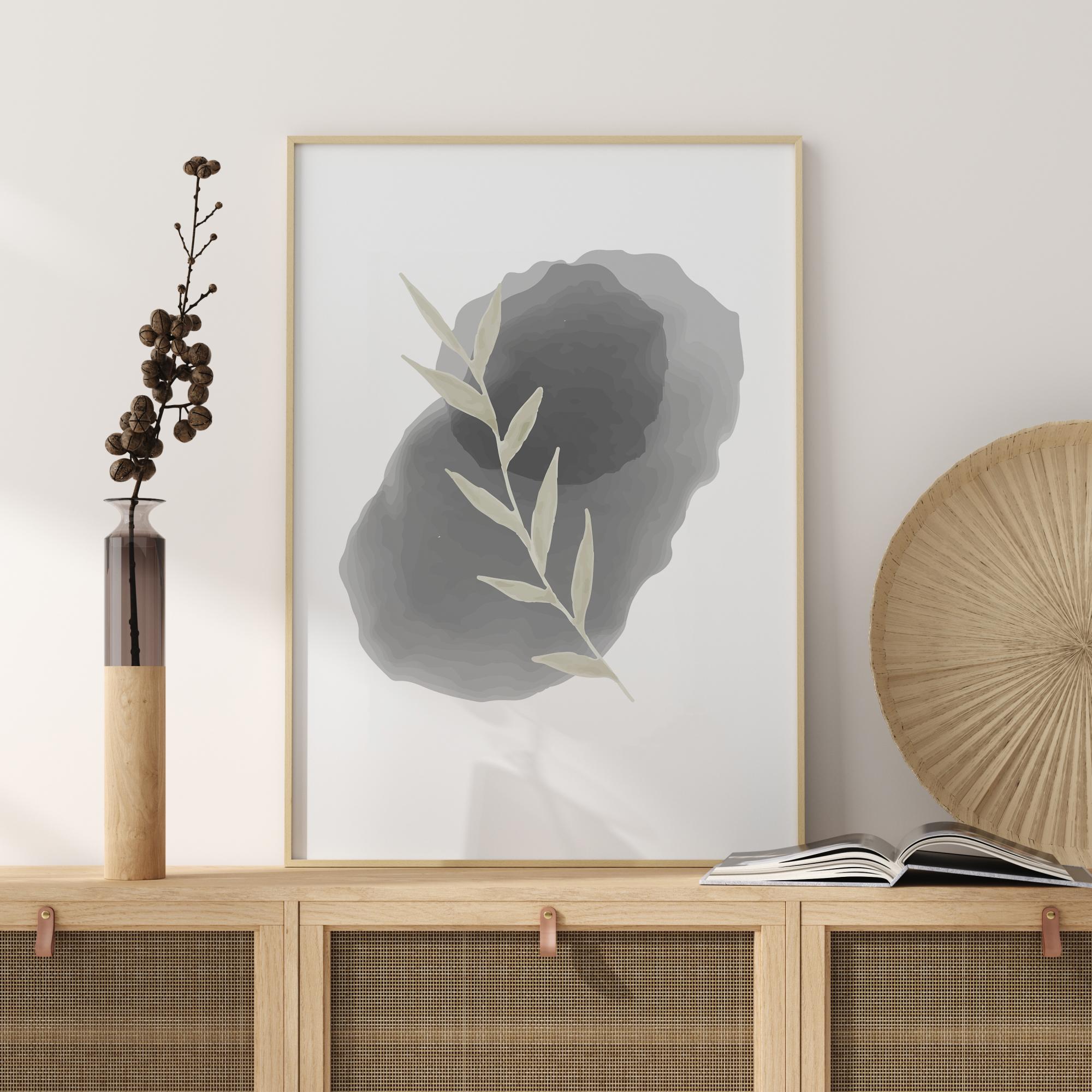 Une affiche simple d'une feuille de couleur beige positionnée sur une pierre de forme ovale. Sur un fond blanc, la feuille est posée sur deux pierres différentes : une petite pierre noire, posée sur une plus grande pierre beige. Apportez une touche de délicatesse à votre intérieur avec ce poster.