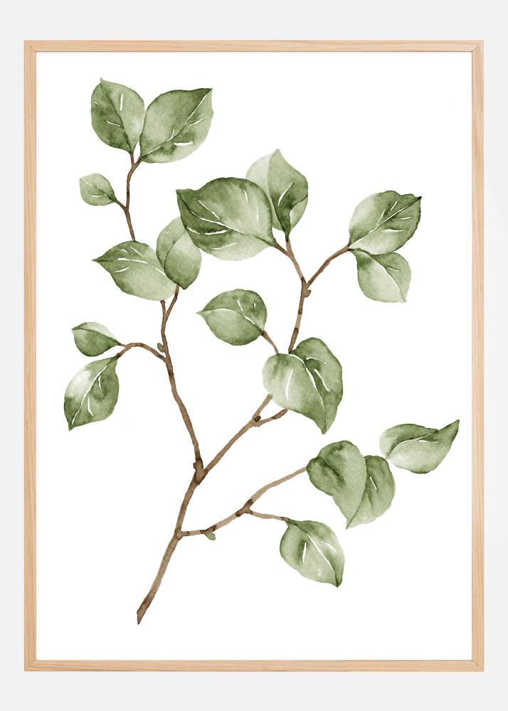 Une belle peinture d'une fine branche brune avec de petites feuilles vertes. Les bruns et verts doux mettent en valeur les délicates veines blanches des feuilles sur fond blanc. Une belle affiche à accrocher sur un mur vert clair.