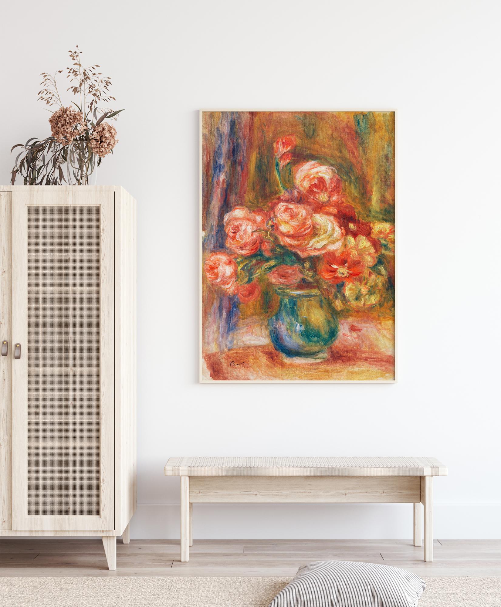 Un magnifique bouquet de roses peint à la main. Cette superbe affiche de roses orange et rouges dans un vase vert et coloré crée un sentiment chaleureux et apaisant. La combinaison des couleurs sur un fond multicolore se marie parfaitement les unes aux autres. Faites briller votre maison avec ce charmant poster.