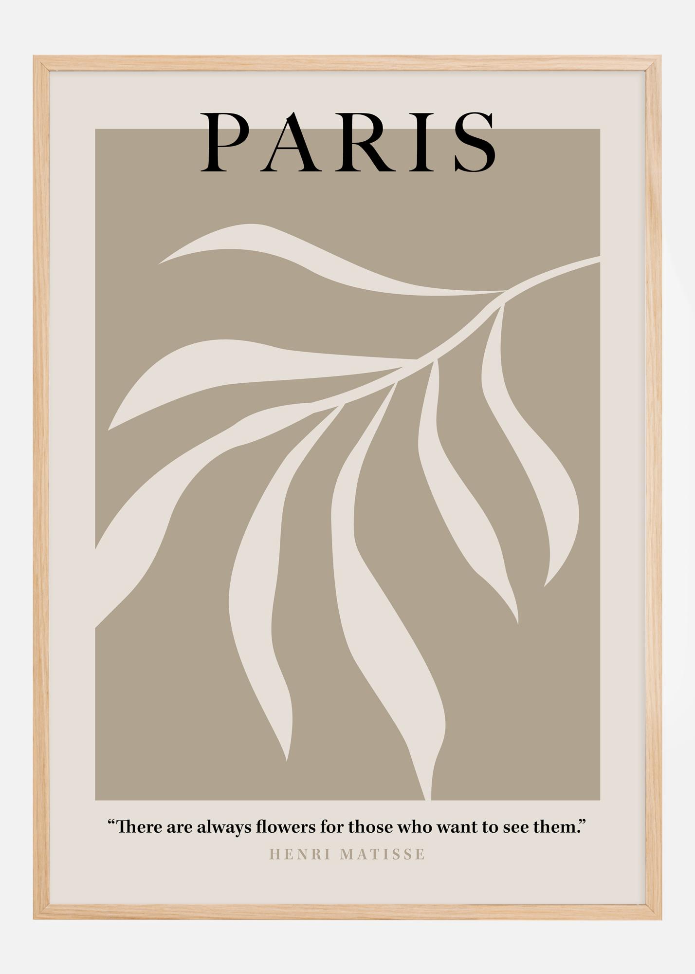 Cette affiche élégante et épurée rend hommage à Paris, la ville qui a inspiré tant d'artistes et de poètes. Son design simple mais puissant se compose de lignes blanches formant une flore abstraite, sur un fond beige uniforme. Le texte "PARIS" est joliment placé en haut, ce qui donne une association directe avec la classe et l'intemporalité de la ville. En bas se trouve une citation de Henri Matisse, "Il y a toujours des fleurs pour ceux qui veulent les voir.", qui ajoute une couche de profondeur et de réflexion à cette affiche déjà significative.