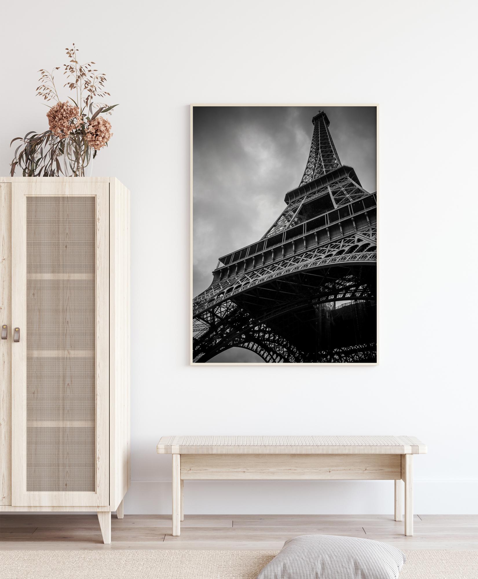 Une affiche en perspective du bas vers le haut de l'époustouflante Tour Eiffel. Avec le ciel gris nuageux, cette magnifique structure en fer montre sa forme pyramidale en s'élevant. Pour tous ceux qui aiment Paris, c'est un poster idéal à offrir en cadeau.