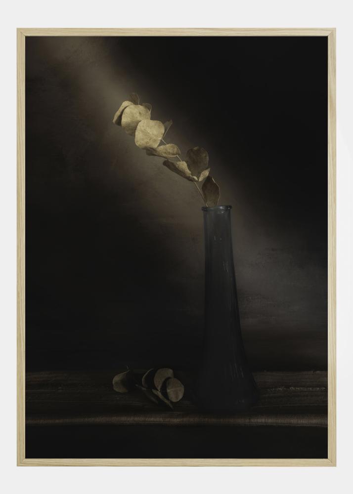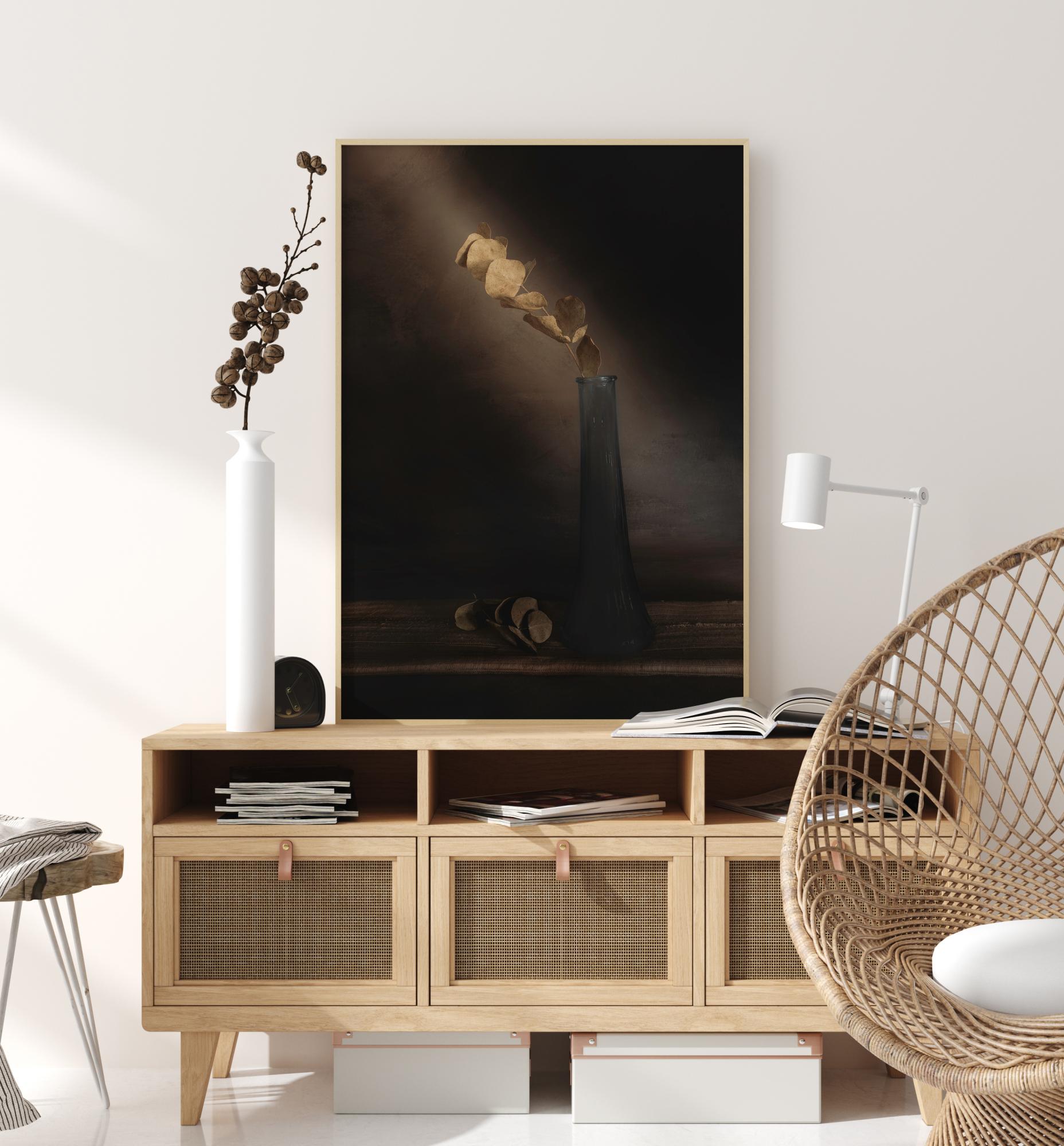 Une affiche simple mais magnifique d'une seule tige de feuilles séchées dans un vase en verre. Sur un fond brun clair, la lumière naturelle éclaire directement l'herbe séchée. Au bas de l'impression se trouve une collection de feuilles qui sont tombées de la tige. Une impression délicieuse à accrocher dans un environnement paisible.